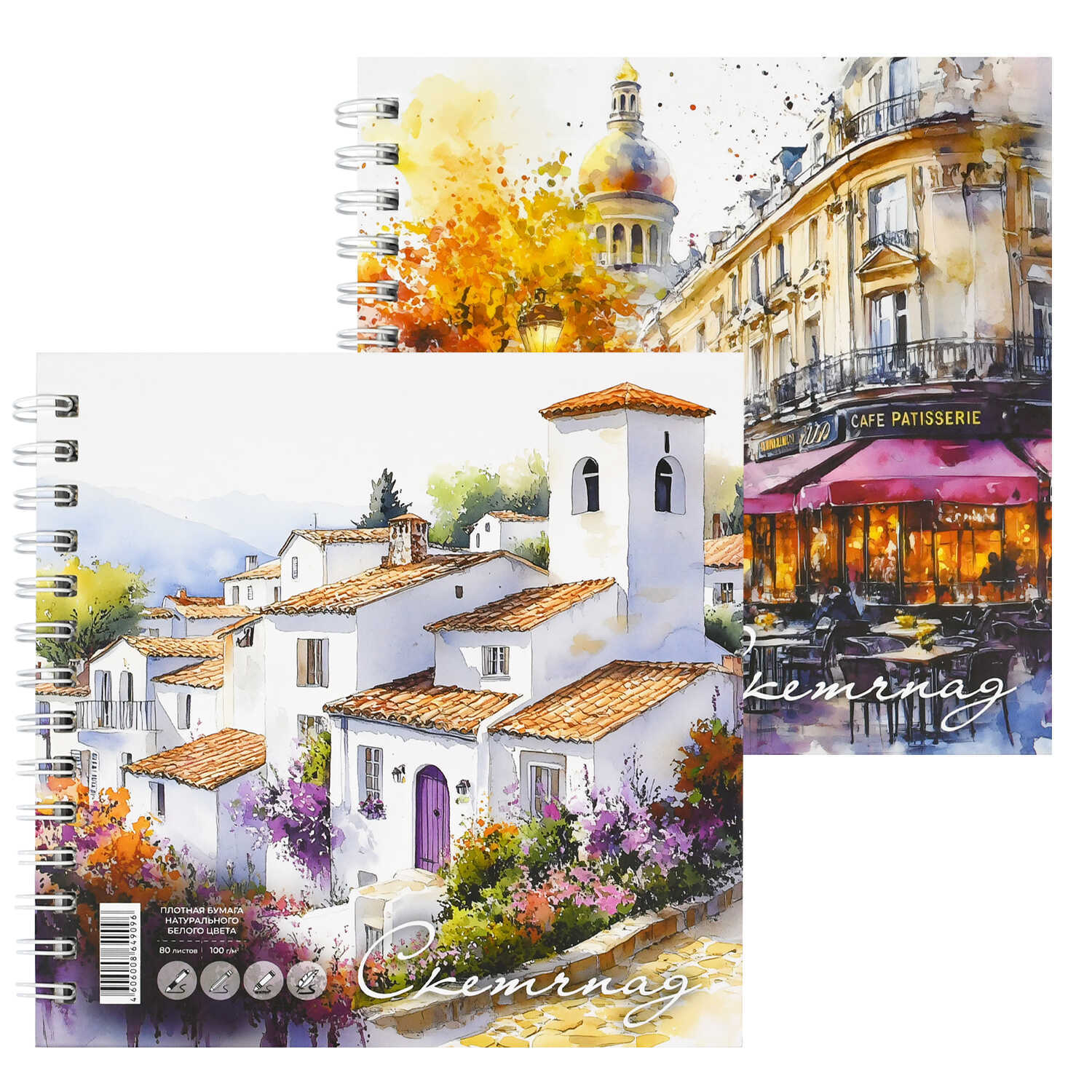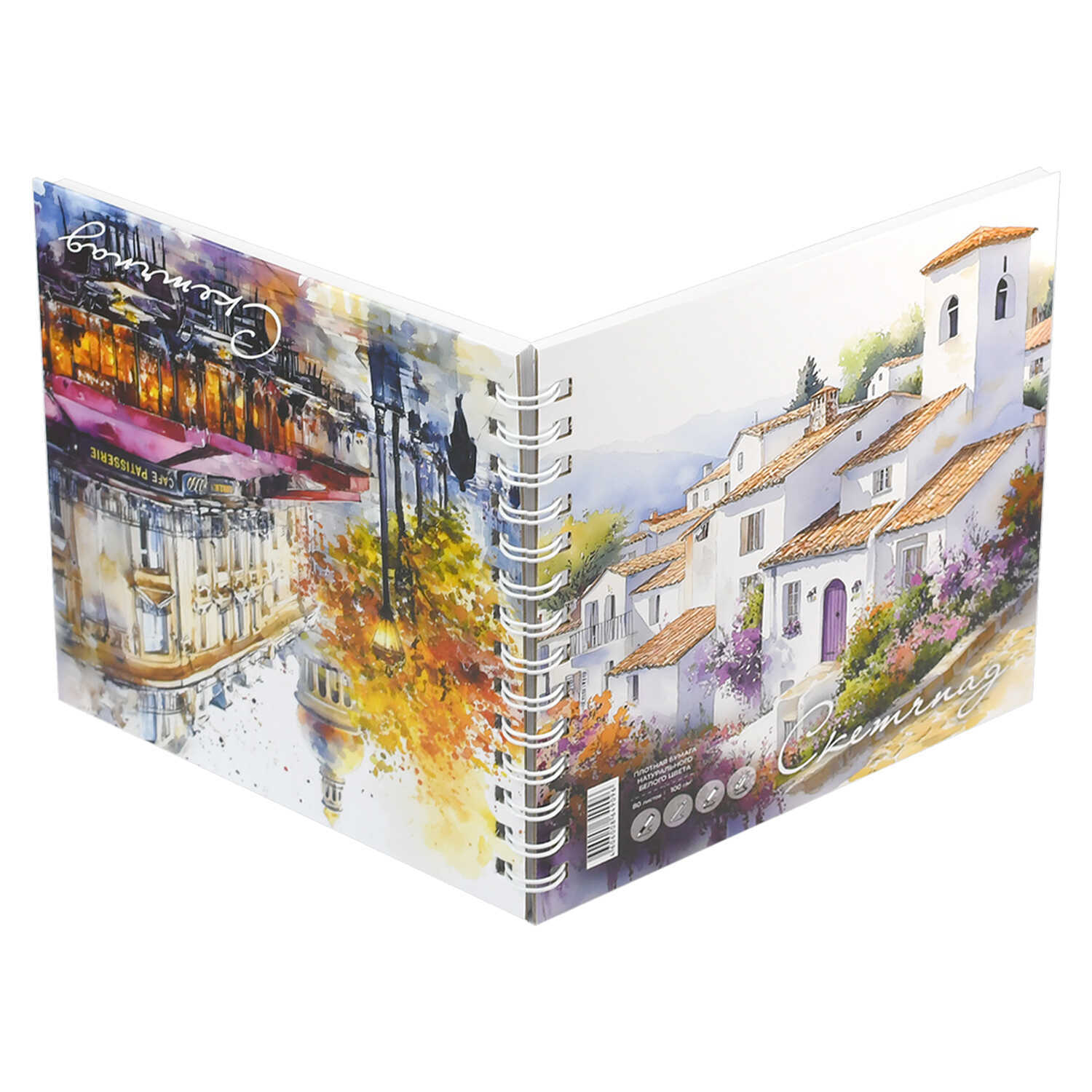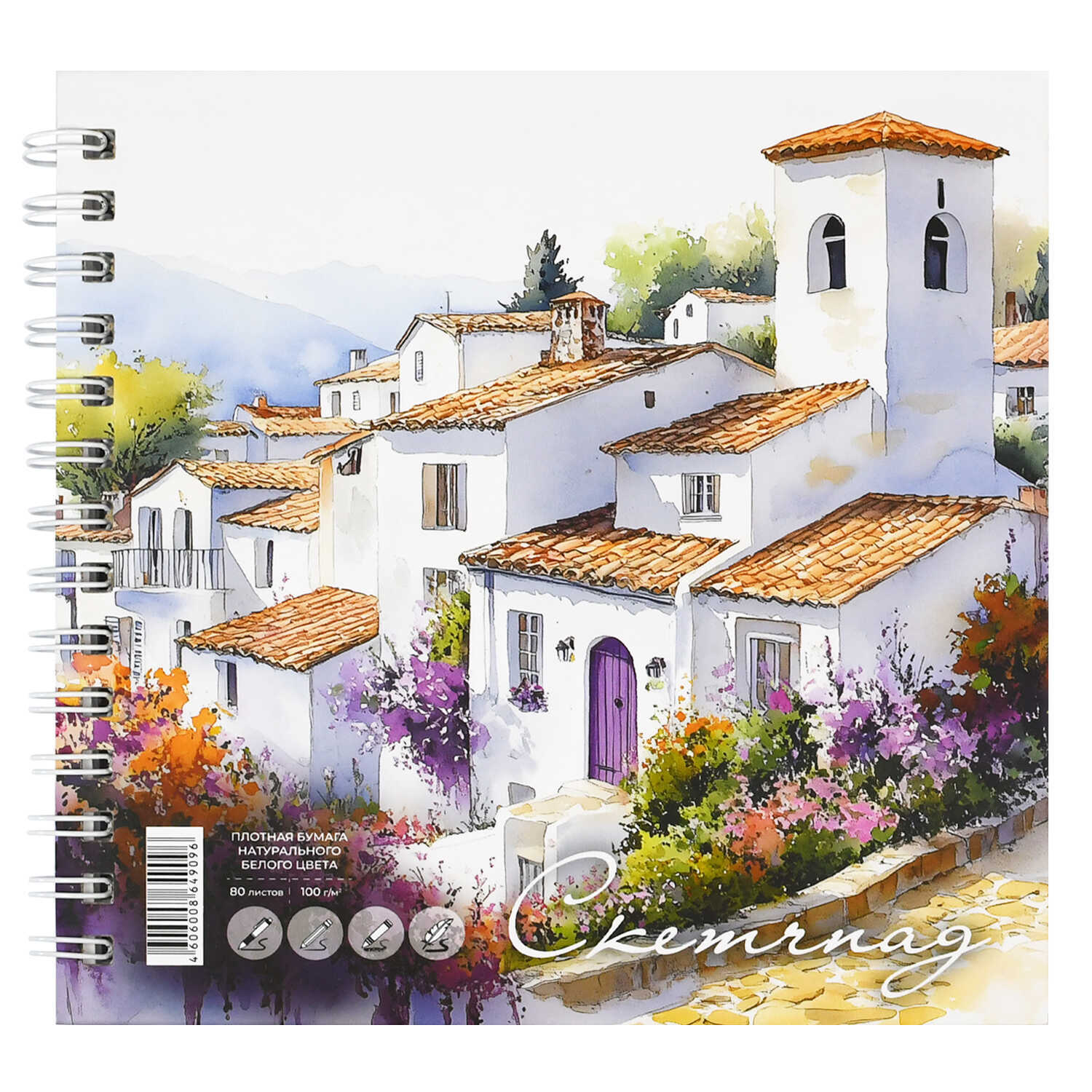 Альбом для рисования (Скетчпад) 195x195 мм, 80 л, блок - белый офсет 100 г/м², арт. 71630 АКВАРЕЛЬ /обложка полноцветная печать, твёрдый переплёт на гребне, матовая ламинация