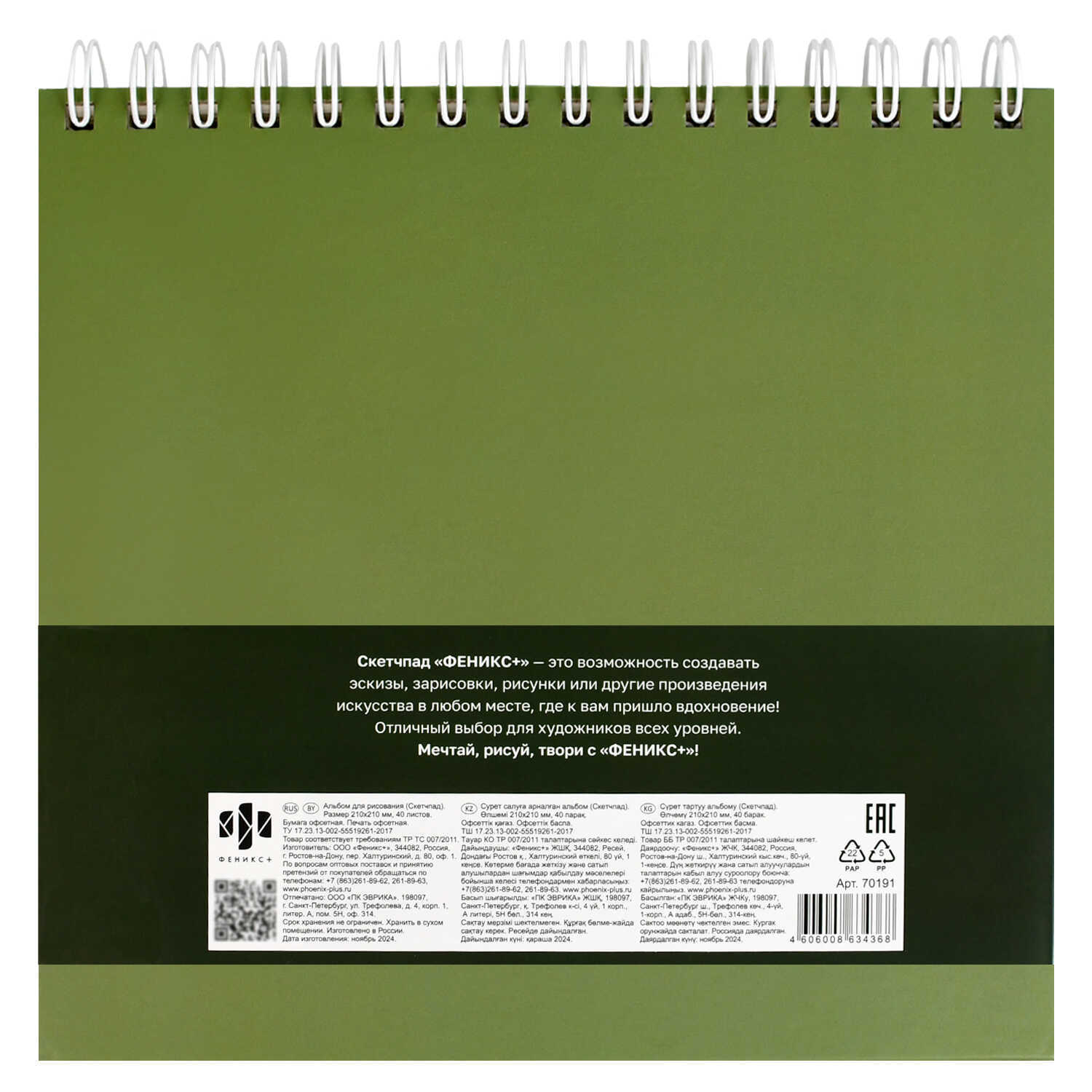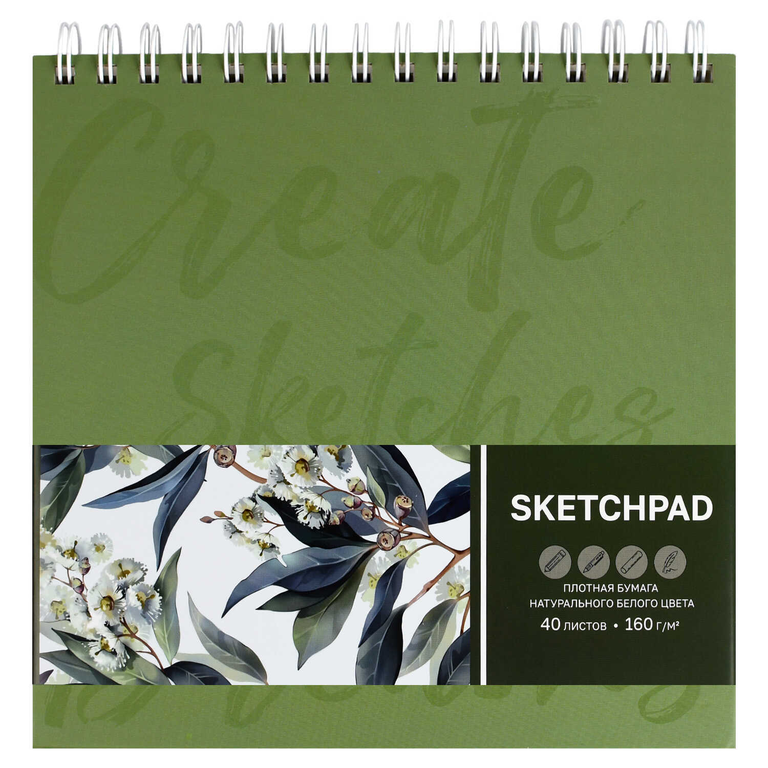 Альбом для рисования (Скетчпад) 210х210 мм, 40 л, блок - белый офсет 160 г/м², арт. 70191 ЭВКАЛИПТ /обложка полноцветная печать, твёрдый переплёт на гребне, матовая ламинация, УФ-лак выборочный