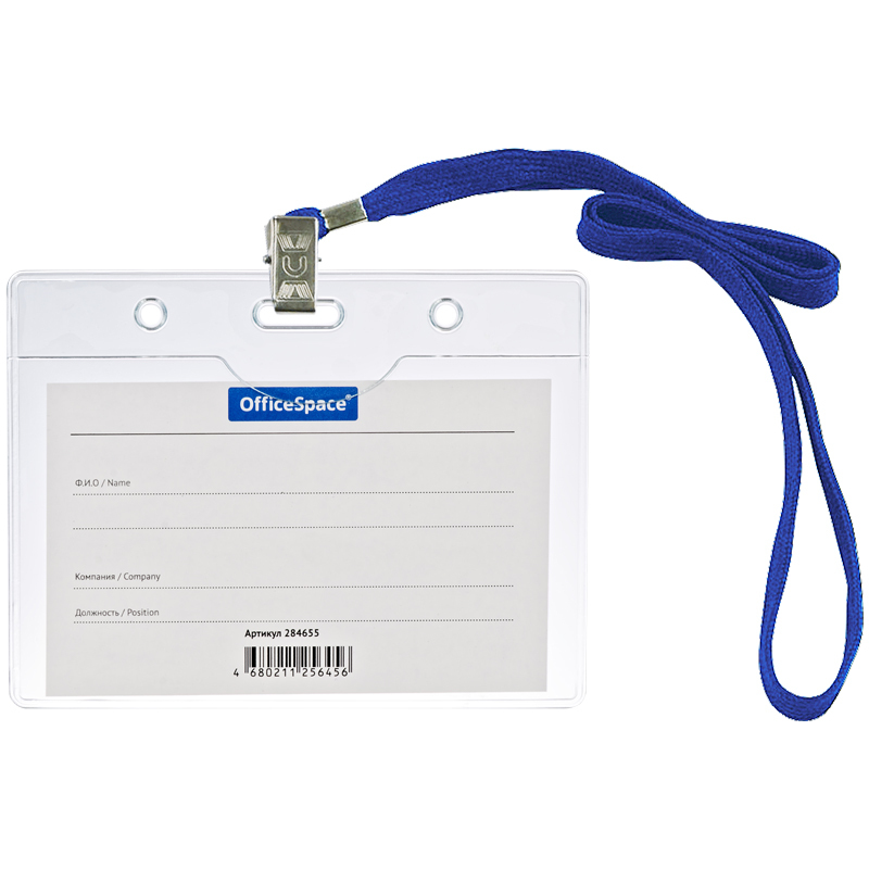 Бейдж горизонтальный из мягкого прочного пластика. Съемный текстильный шнурок крепится к бейджу с помощью металлической клипсы. Цвет шнурка - синий. В комплект входит вкладыш с полями для персональных данных. Подходит для пропуска, визитки, именной карточки.