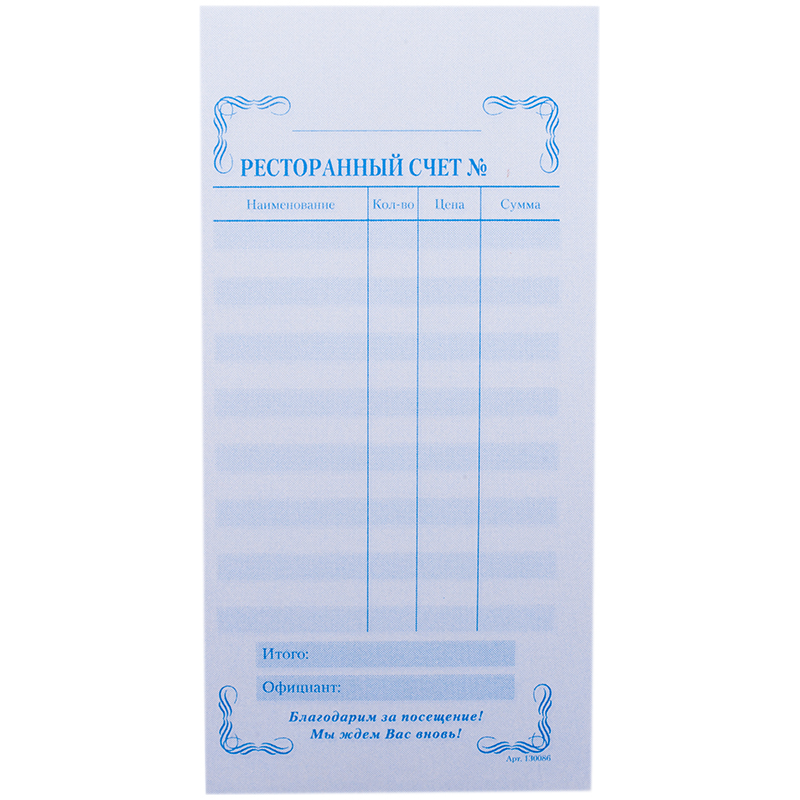 Бланк двухслойный самокопирующийся "Ресторанный счет". Бланк изготовлен из самокопирующейся бумаги. На верхний лист текст наносится обыкновенной ручкой, карандашом или матричным принтером. Оттиск черного цвета появляется одномоментно на нижележащем листе. Бланки изготовлены из офсетной бумаги. В склейке 50 экземпляров. Упаковка в термоусадочную пленку.