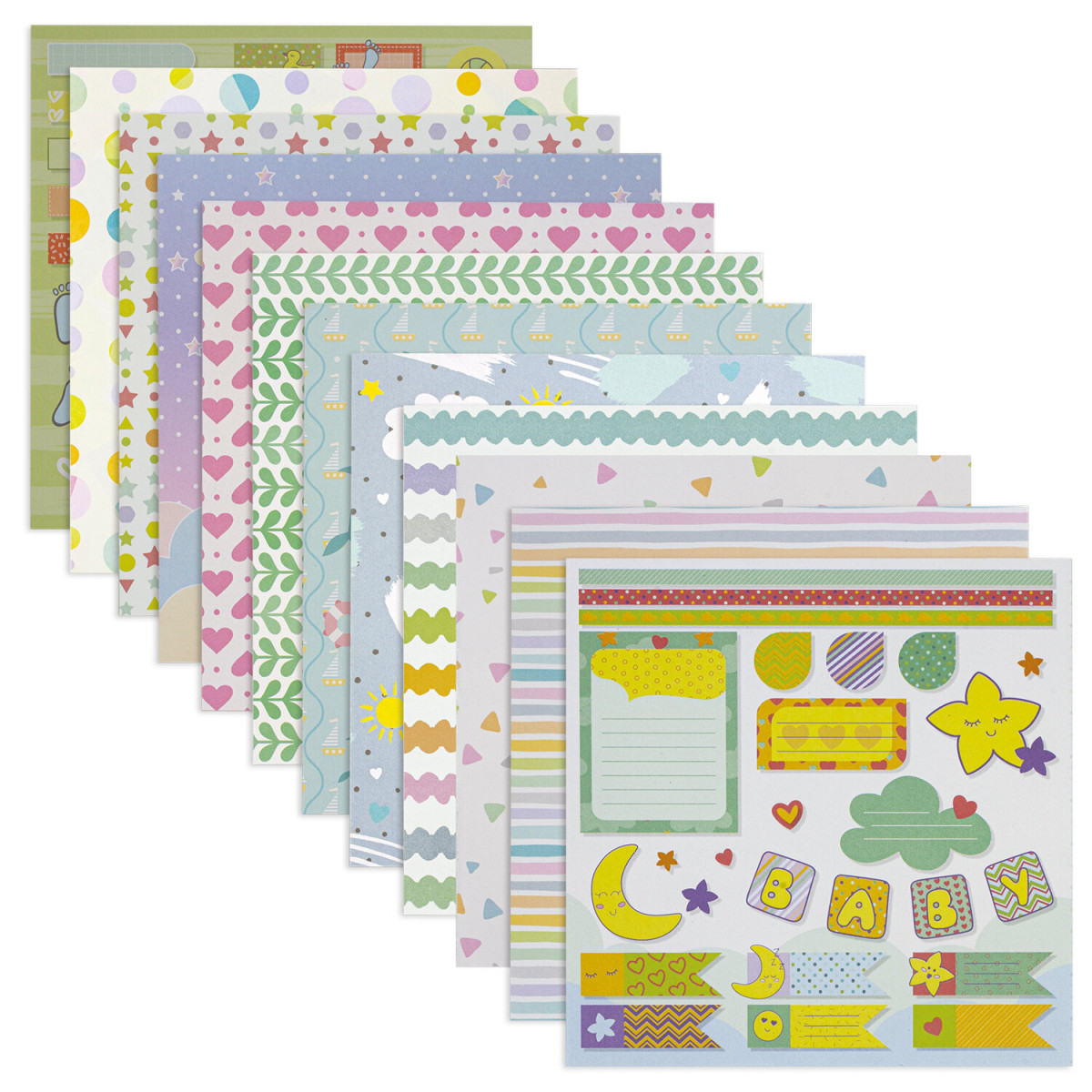 В набор входит 12 листов двусторонней бумаги плотностью 180 г/м2, содержащих 12 различных дизайнов: 10 фоновых дизайнов и 2 набора фигурок для вырезания. Стандартный размер бумаги 30х30 см делает её удобной для использования в создании скрап-альбомов.Стиль "Бэби-бук" содержит милые детские дизайны, прекрасно подходящие для создания фотоальбомов, открыток и других изделий в детской тематике.Матовая бумага отличается высоким качеством печати.Отзывы