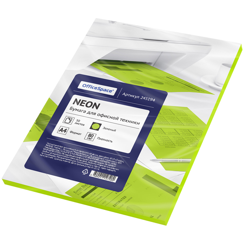 Цветная бумага формата А4, плотность 80 г/м2, цвет neon зеленый, 50 листов, упаковка - пакет с клеевой полосой.