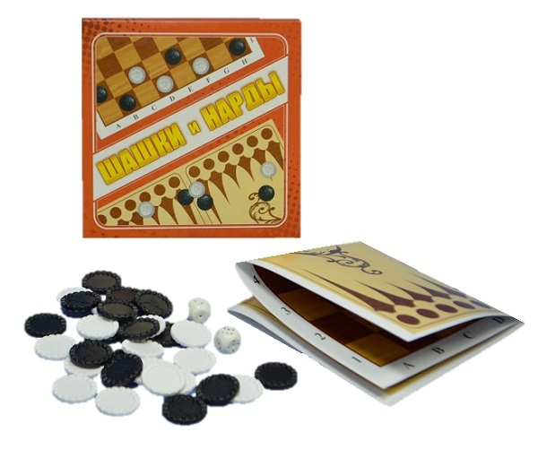 Также в комплект входят по 15 шашек двух цветов, два кубика с точками, а также