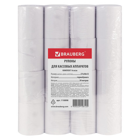 Cостоит из бумажной основы с нанесением на неё термочувствительного химического состава. Рулоны изготовлены на современном оборудовании, обеспечивающем ровную намотку и отсутствие бумажной пыли. Позволяют получить печать высокого качества и продлевают срок службы оргтехники. Чековая лента с наружным термослоем имеет ширину 57 мм и общую длину 30 м. Диаметр рулона - 46 мм, диаметр втулки - 12 мм. Плотность бумаги чековой ленты - 48 г/м2. Поставляется в термоусадочной пленке. 16 штук в комплекте.
