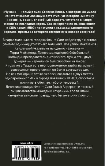 В парке маленького городка Флинт-Сити найден труп жестоко убитого одиннадцатилетнего мальчика. Все улики, показания свидетелей указывают на одного человека - Терри Мейтленда. Тренер молодежной бейсбольной команды, преподаватель английского, муж и отец двух дочерей - неужели он был способен на такое?К тому же у Терри есть неопровержимое алиби: на момент совершения преступления он был в другом городе.Но как мог один и тот же человек оказаться в двух местах одновременно? Или в городе появилось НЕЧТО, способное принимать обличие любого человека?..Детектив полиции Флинт-Сити Ральф Андерсон и частный сыщик агентства "Найдем и сохраним" Холли Гибни намерены выяснить правду, чего бы им это ни стоило… Пять причин купить 1Роман в кинообложке к выходу одноименного сериала HBO. 2Самый сильный роман автора со времен легендарного «Оно». 3Автор снова весьма успешно пользуется приемом «ужаса в маленьком городке», затягивает читателей в повествование с самых первых страниц и не отпускает до самого конца. 4Роман удостоился крайне теплого приема на западе, был признан одной из лучших книг года по версии посетителей портала Goodreads и одной из лучших книг автора за последние десять лет. 5В центре сюжета лежит неразрешимая загадка — человека обвиняют в жестоком убийстве подростка. Против него свидетельствуют неопровержимые доказательства, но и в его защиту говорит железобетонное алиби — в день убийства обвиняемый был в другом городе на глазах сотен свидетелей. Так кто же тогда убийца?