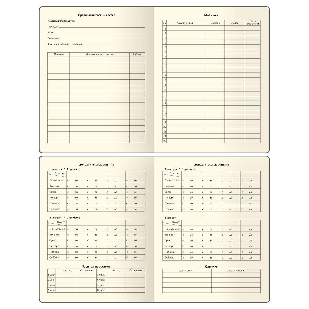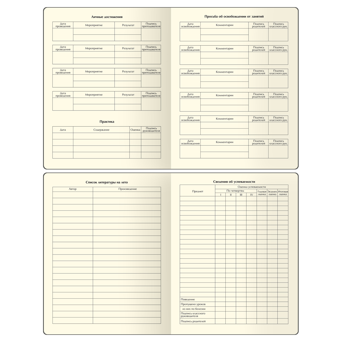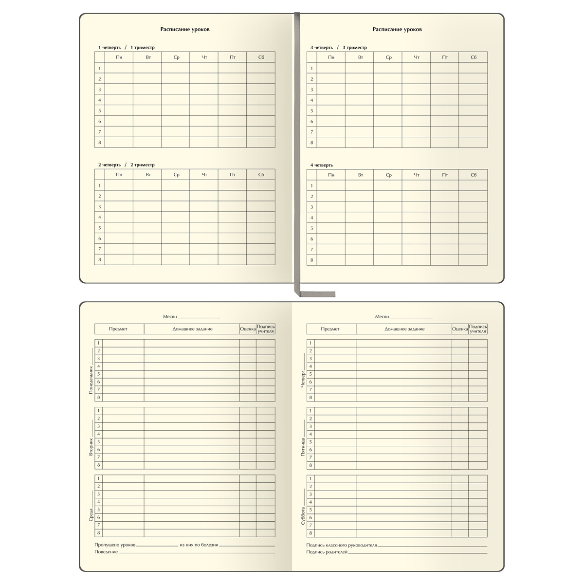 Внутренний блок состоит из 48 листов тонированной офсетной бумаги плотностью 70 г/м2. Печать блока в 1 краску. Учебный день рассчитан на 8 уроков. Дневник содержит 14 страниц для личных данных.