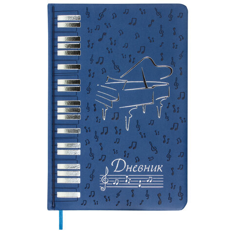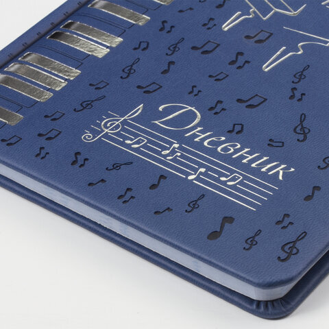Внутренний блок изготовлен из белой офсетной бумаги повышенной плотности 70 г/м2. Содержит 48 листов для ведения записей и справочной информацией - длительности нот, интервалы, знаки в тональностях, ключи и пр. Обложка выполнена в черном цвете из экокожи - презентабельного и износоустойчивого материала. Элементы дизайна выполнены с помощью термотиснения и фольги. Для удобства использования дневник снабжен закладкой-ляссе.