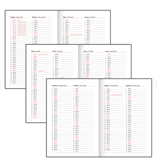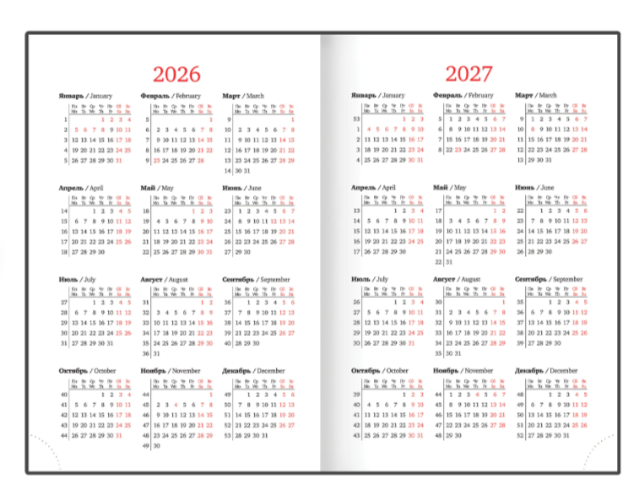 Внутренний блок включает 168 листов белой бумаги плотностью 70 г/м2. Каждая страничка имеет перфорированный угол. Благодаря стандартному формату А5 (138х213 мм) ежедневник удобно использовать как в офисе, так и на выездных деловых встречах.