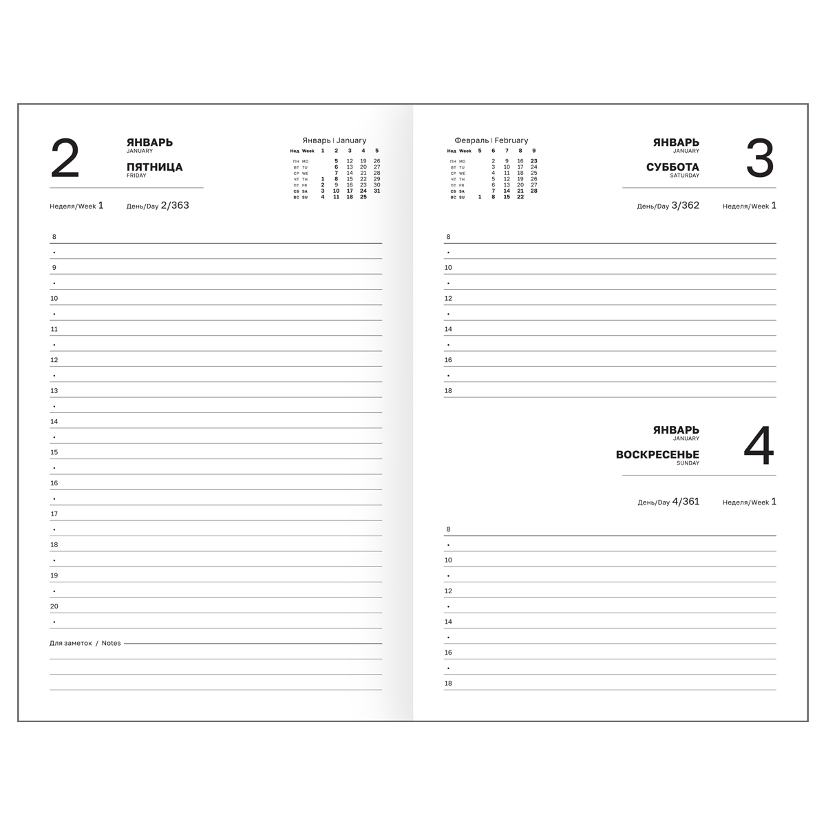 Формат – А5 (145*205 мм). Изделие состоит из 176 листов белой бумаги плотностью 65 г/м2, которая подходит для любых типов ручек и не будет просвечиваться. В линованный блок с полем для даты и планингом удобно записывать встречи, идеи и задачи. Уголки листов с перфорацией. Закладка-ляссе позволит быстро и легко найти нужную страницу, что делает навигацию по ежедневнику удобной и эффективной. В ежедневнике предусмотрена справочная информация, ежемесячный планер, календарь и другие полезные сведения. Индивидуальная упаковка в термоусадочную пленку.