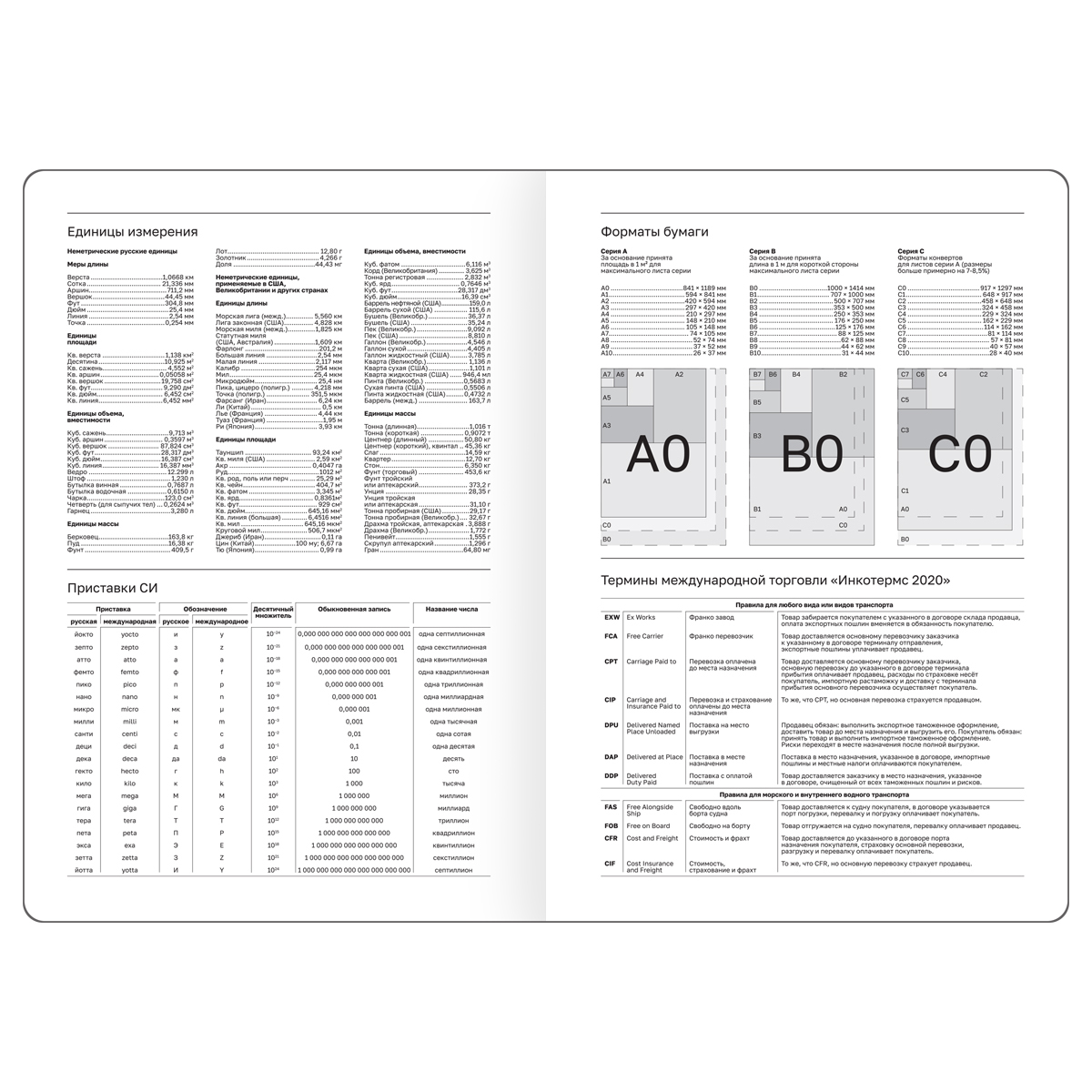 Формат – А5 (145*205 мм). Изделие состоит из 176 листов белой бумаги плотностью 65 г/м2, которая подходит для любых типов ручек и не будет просвечиваться. В линованный блок с полем для даты и планингом удобно записывать встречи, идеи и задачи. Уголки листов с перфорацией. Закладка-ляссе позволит быстро и легко найти нужную страницу, что делает навигацию по ежедневнику удобной и эффективной. В ежедневнике предусмотрена справочная информация, ежемесячный планер, календарь и другие полезные сведения. Индивидуальная упаковка в термоусадочную пленку.