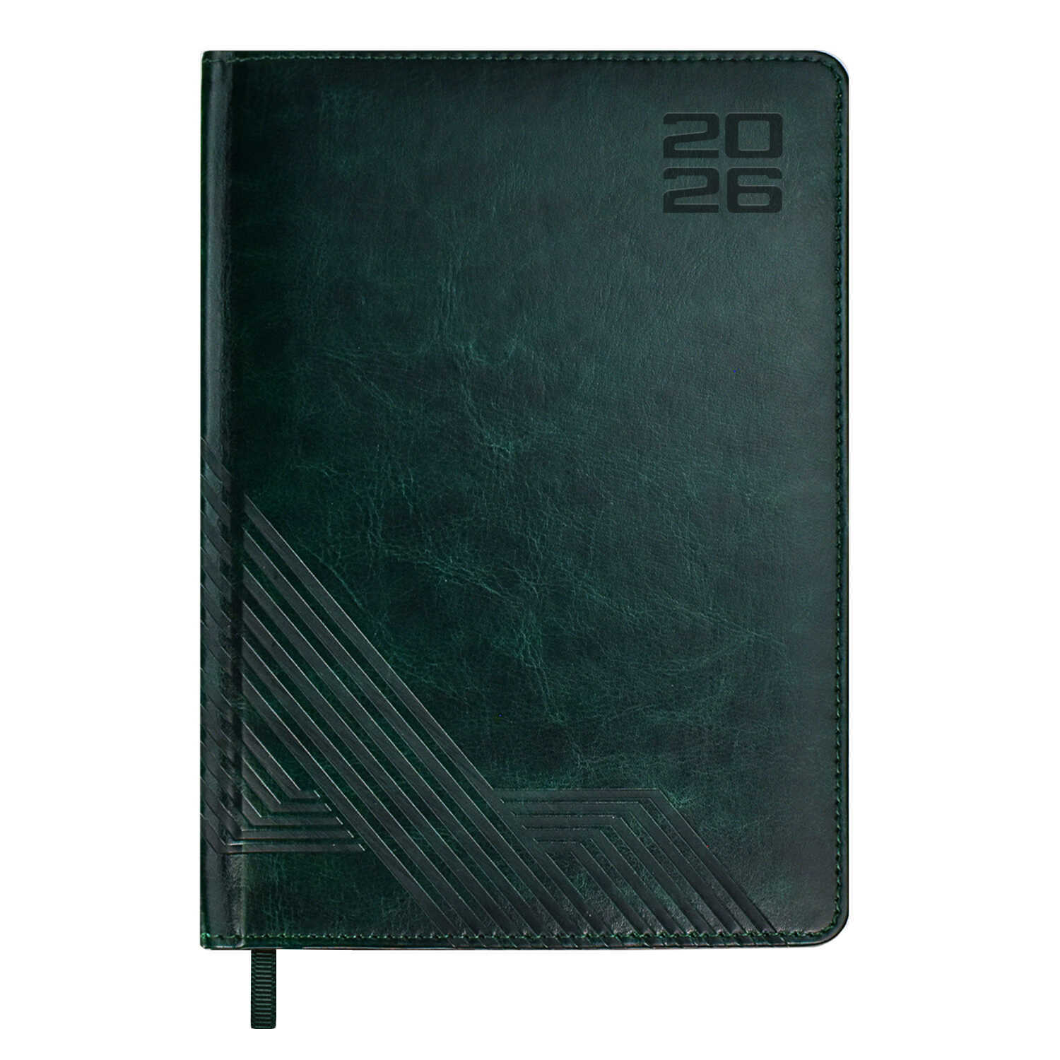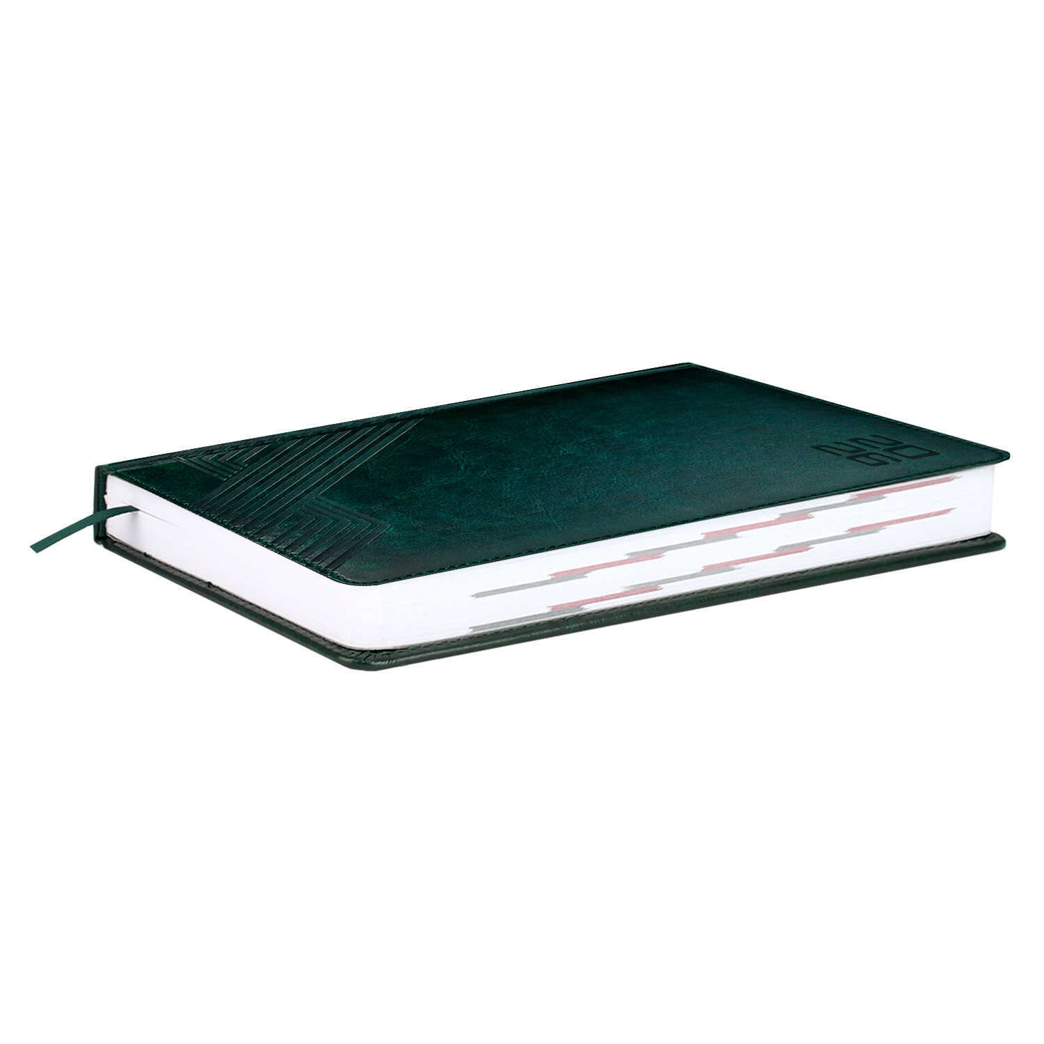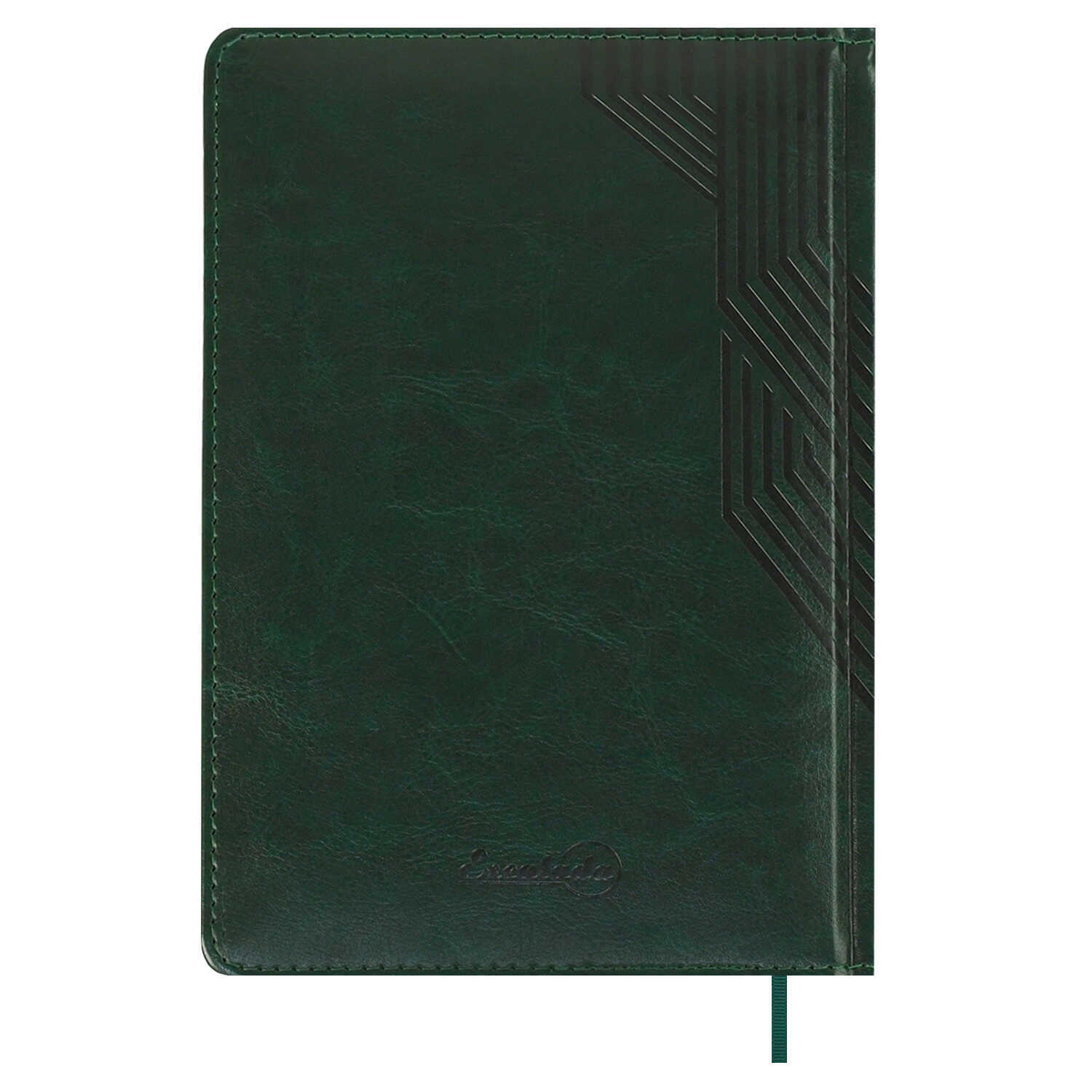 Ежедневник датированный 2026 ESCALADA, А5, 176 л., арт. 70223/ 15 САРИФ ТЁМНО-ЗЕЛЁНЫЙ (кожзам: 146x211 мм, твёрдый переплёт с поролоном, материал обложки: искусственная кожа "Сариф"; декор: блинтовое тиснение; способ крепления блока: ниткошвейный; вн. блок: 176 л., белый офсет 70 г/м², печать в две краски (линия), справочный материал: есть; перфорация углов блока: есть; закладка/-и: одно ляссе; каптал: есть; форзац: печать в одну краску; персонализация возможна: да; индивидуальная упаковка: ПЭТ-пакет)