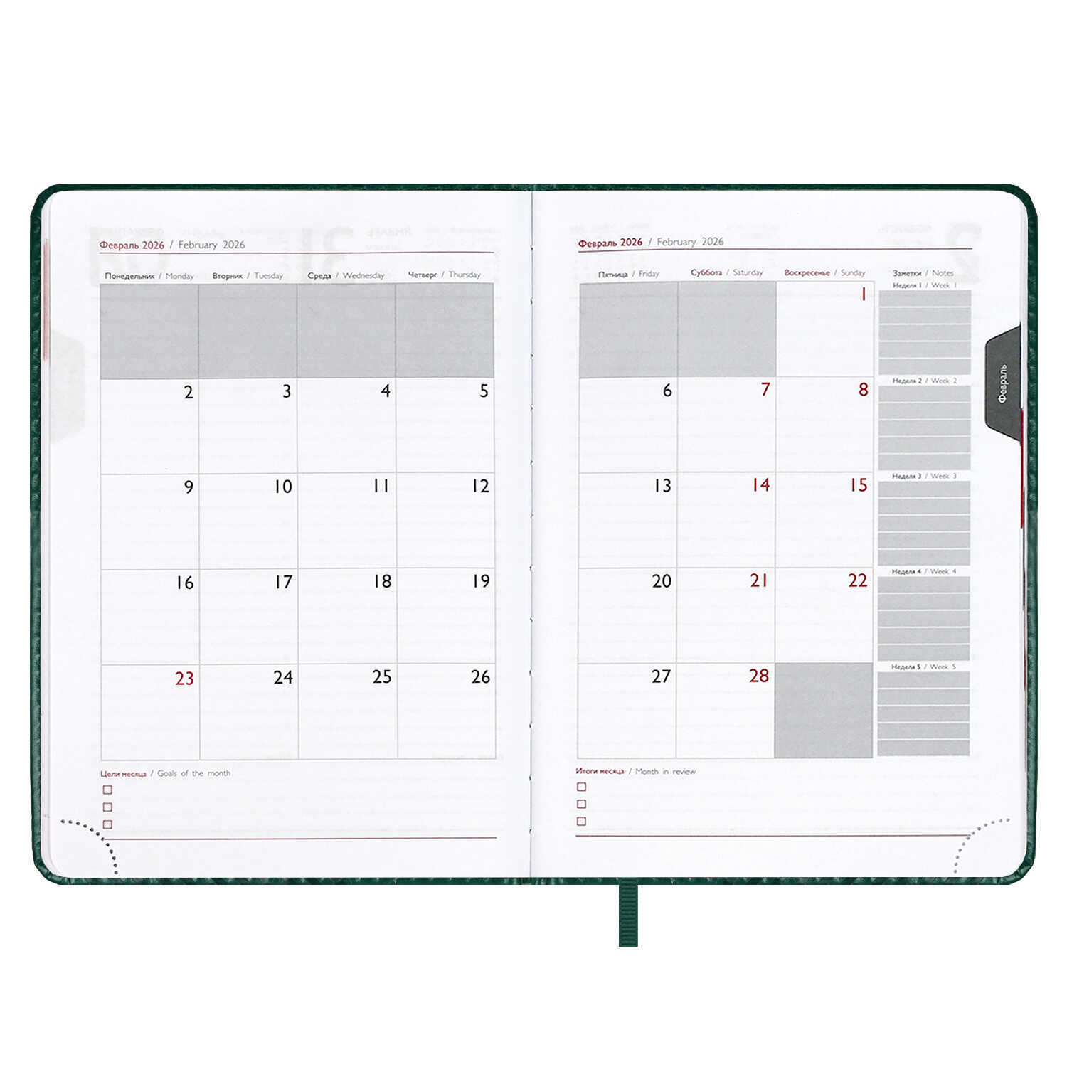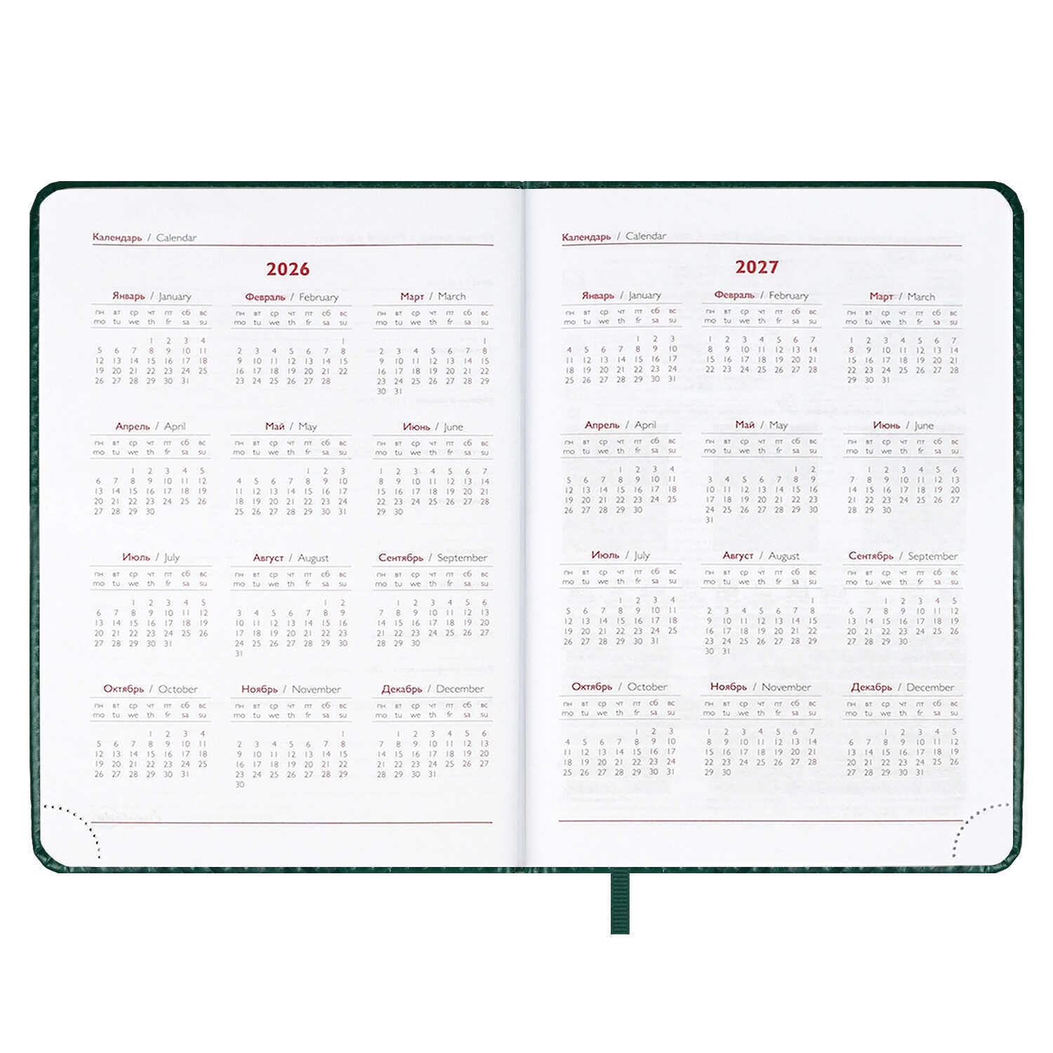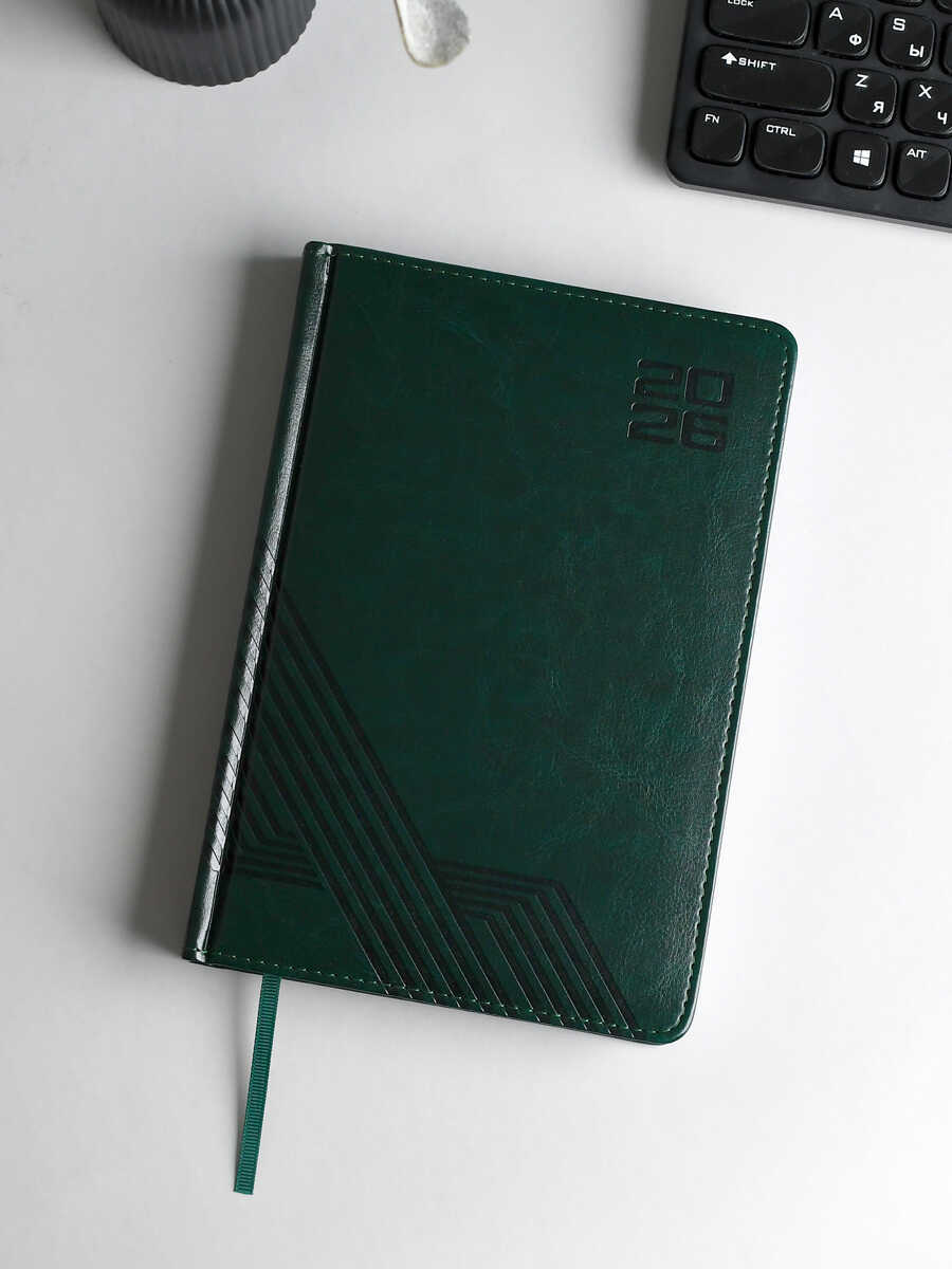 Ежедневник датированный 2026 ESCALADA, А5, 176 л., арт. 70223/ 15 САРИФ ТЁМНО-ЗЕЛЁНЫЙ (кожзам: 146x211 мм, твёрдый переплёт с поролоном, материал обложки: искусственная кожа "Сариф"; декор: блинтовое тиснение; способ крепления блока: ниткошвейный; вн. блок: 176 л., белый офсет 70 г/м², печать в две краски (линия), справочный материал: есть; перфорация углов блока: есть; закладка/-и: одно ляссе; каптал: есть; форзац: печать в одну краску; персонализация возможна: да; индивидуальная упаковка: ПЭТ-пакет)
