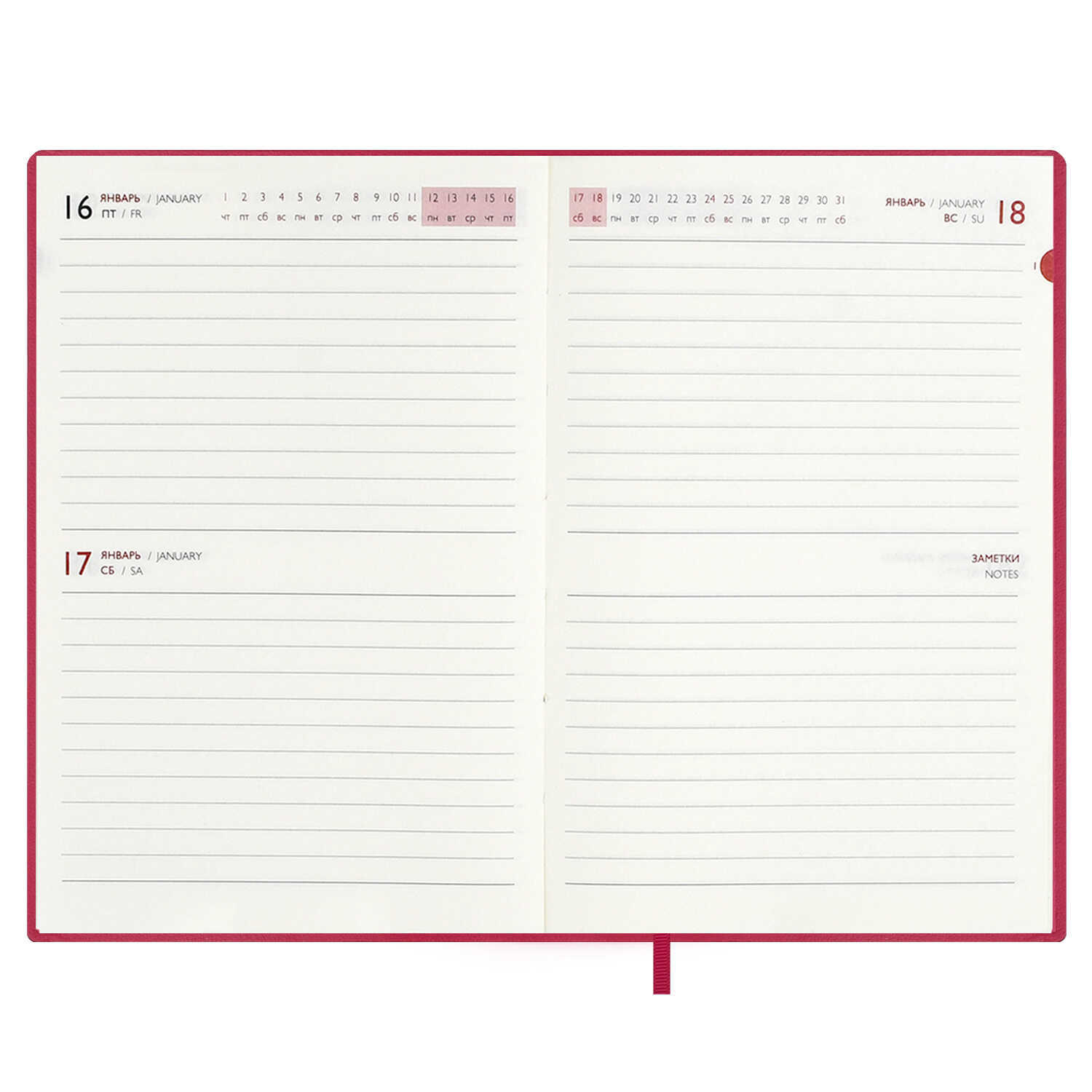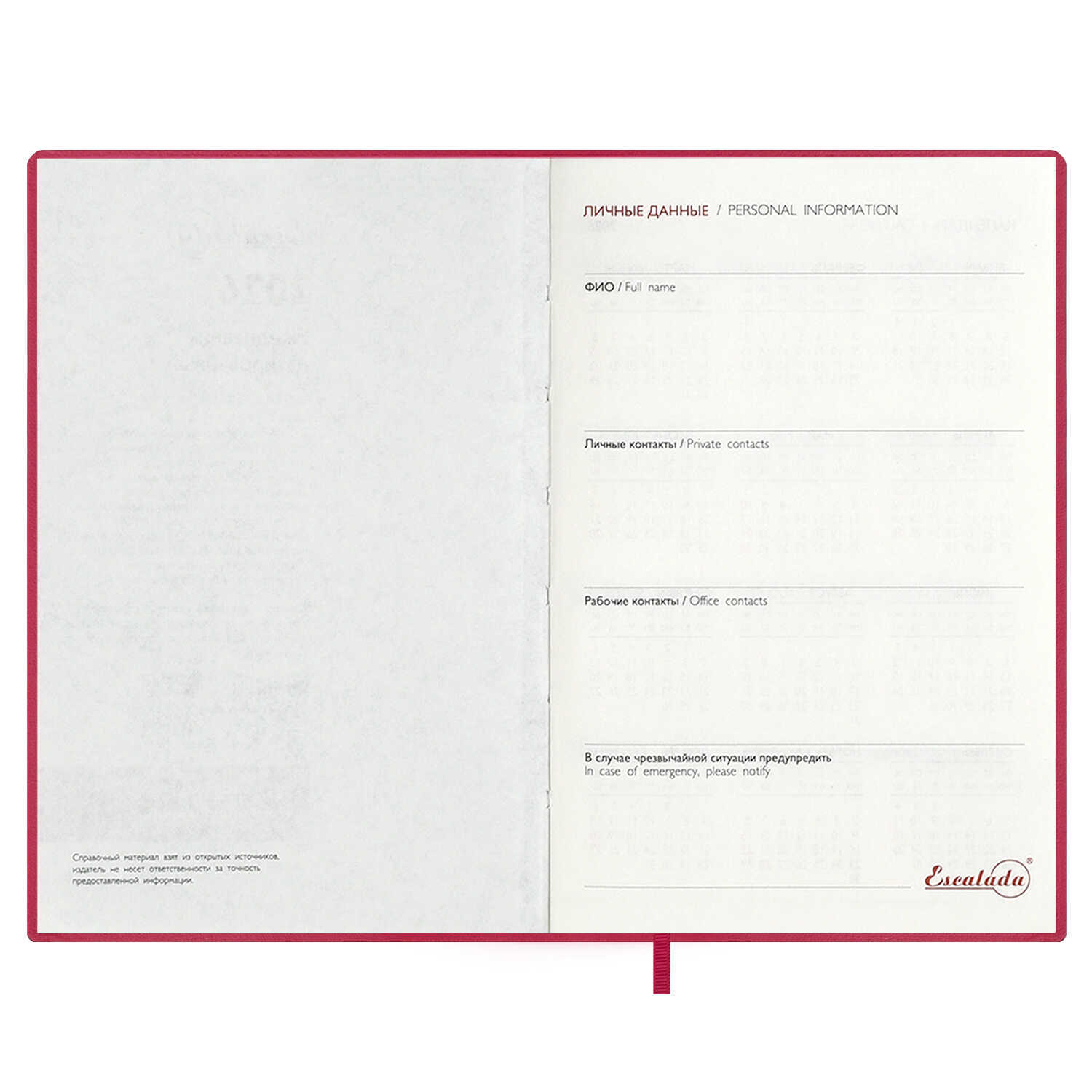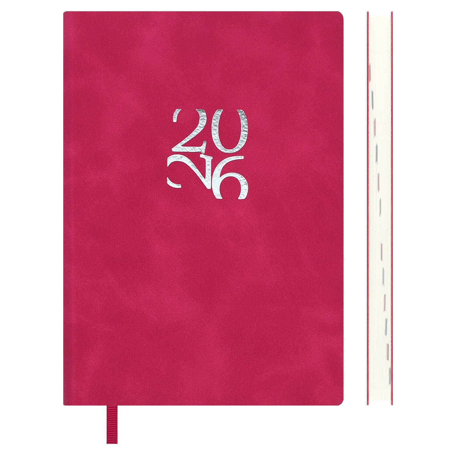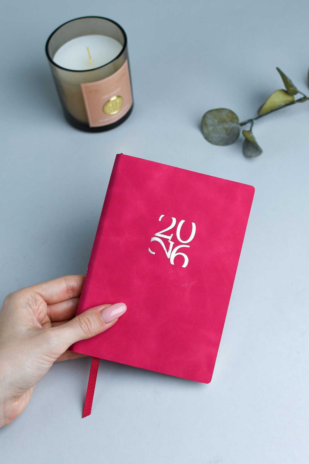 Ежедневник датированный 2026 ESCALADA, А6, 120 л., арт. 70316/ 20 БЕЙБИСКИН МАЛИНОВЫЙ (кожзам: 105x150 мм, мягкий переплёт, материал обложки: искусственная кожа "Бейбискин"; декор: тиснение фольгой; способ крепления блока: ниткошвейный; вн. блок: 120 л., кремовый офсет 70 г/м², печать в две краски (линия), справочный материал: есть; перфорация углов блока: нет; закладка/-и: одно ляссе; каптал: есть; форзац: печать пантоном; персонализация возможна: да; индивидуальная упаковка: ПЭТ-пакет)