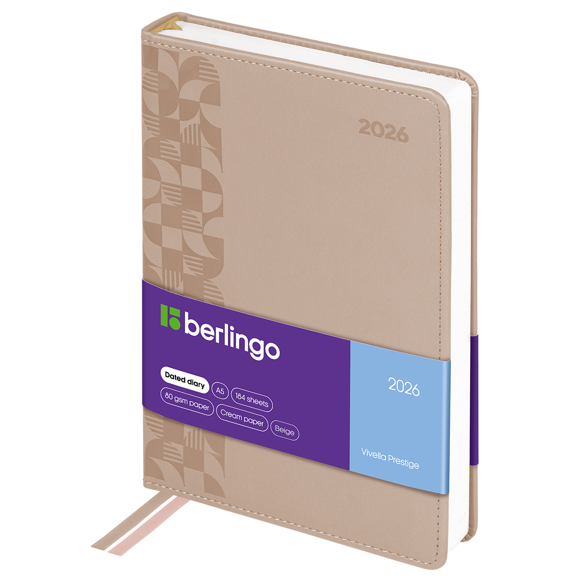 Стильный датированный ежедневник на 2025 год Berlingo "Vivella Prestige" формата А5 (150*215 мм) с классической твёрдой матовой обложкой из бежевой высококачественной экокожи. Имиджевое тиснение на обложке добавляет интересную деталь в её насыщенный цвет.