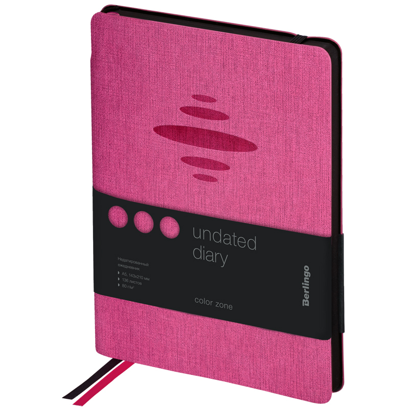 Стильный недатированный ежедневник Berlingo Color Zone формата А5 с ультрамягкой обложкой из экокожи. Обложка с тиснением цвета фуксии ярко контрастирует с черным срезом. Для удобства внутри корешка расположен специальный карман для ручки, ежедневник можно зафиксировать вертикальной резинкой. Внутренний блок состоит из 136 листов высококачественной кремовой бумаги повышенной плотности 80 г/м² с пантонной печатью в 2 краски. Недатированный ежедневник Berlingo Color Zone представлен в размере 143 на 210 мм.