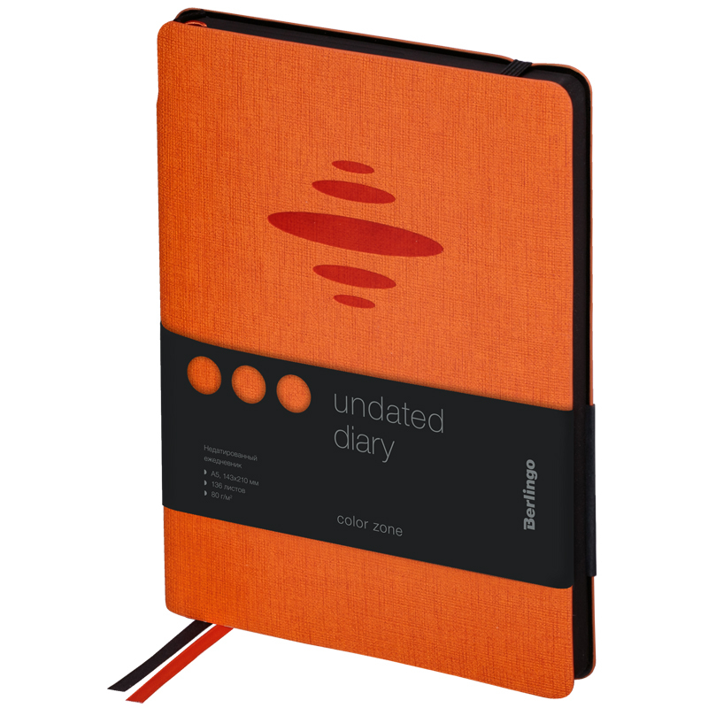 Стильный недатированный ежедневник Berlingo Color Zone формата А5 с ультрамягкой обложкой из экокожи. Оранжевый цвет обложки с тиснением ярко контрастирует с черным срезом. Для удобства внутри корешка расположен специальный карман для ручки, ежедневник можно зафиксировать вертикальной резинкой. Внутренний блок состоит из 136 листов высококачественной кремовой бумаги повышенной плотности 80 г/м² с пантонной печатью в 2 краски. Недатированный ежедневник Berlingo Color Zone представлен в размере 143 на 210 мм.