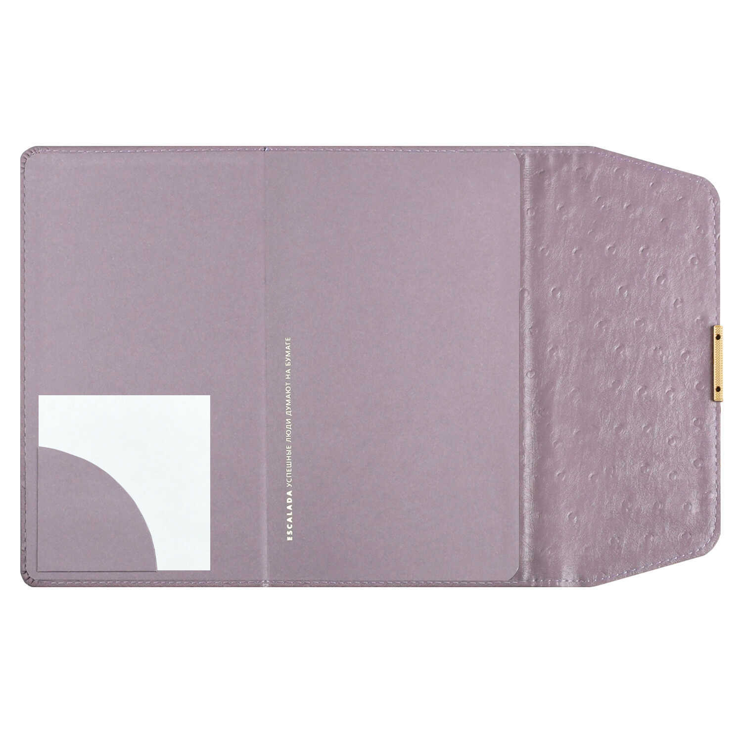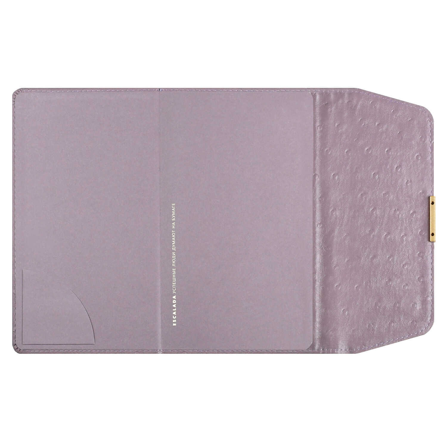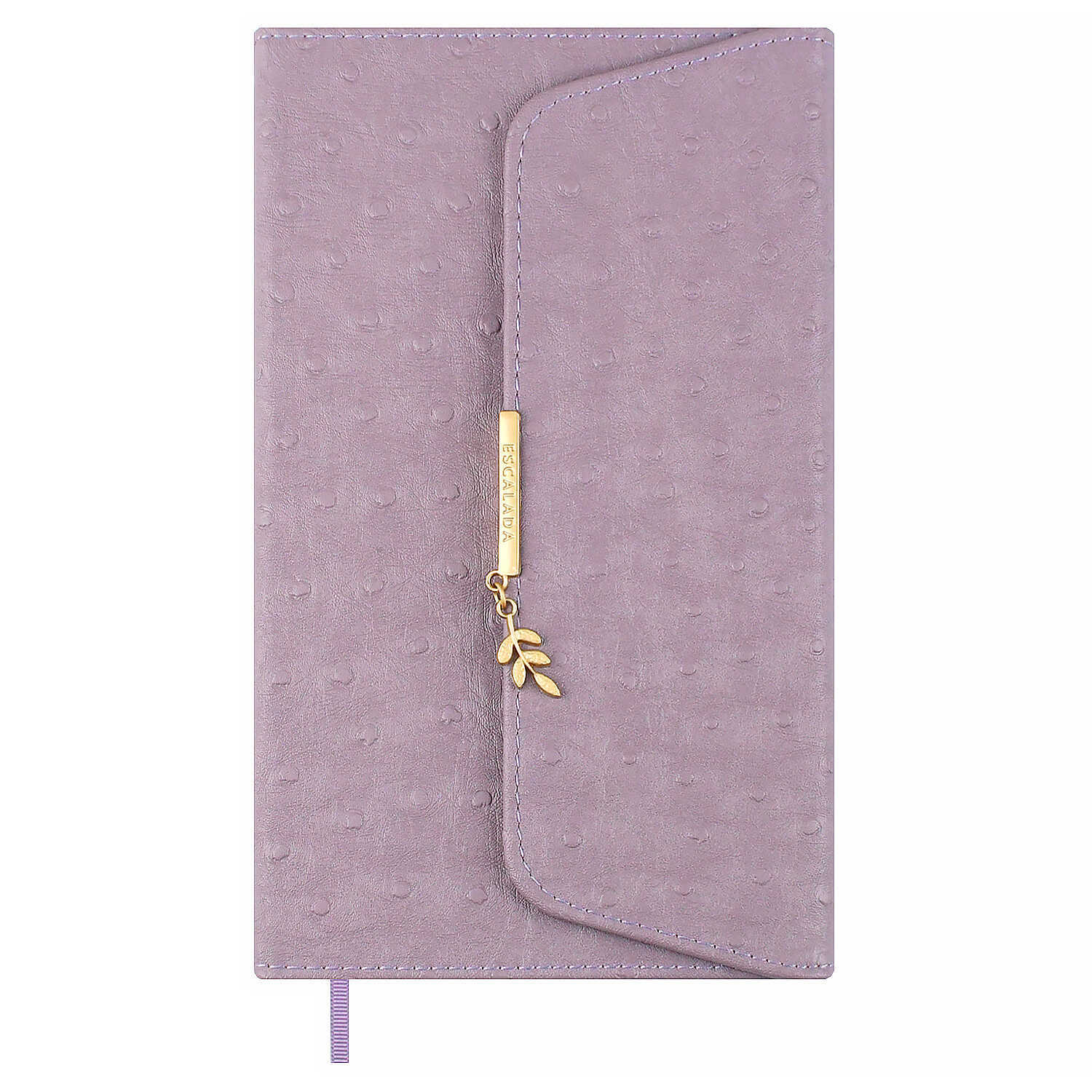 Ежедневник недатированный ESCALADA, А5, 160 л., арт. 70670/ 15 СТРАУС ФИОЛЕТОВЫЙ (кожзам: 126х211 мм, твёрдый переплёт, материал обложки: искусственная кожа "Страус"; способ крепления блока: ниткошвейный; декор: металлический шильд с декоративной металлической фигуркой; вн. блок: 160 л., кремовый офсет 70 г/м², печать в одну краску (линия), справочный материал: есть; перфорация углов блока: нет; отделка среза: окрашивание пантоном; закладка/-и: одно ляссе, каптал: есть; форзац: печать пантоном, тиснение фольгой, особенности: карман-уголок внутренний, магнитный клапан; персонализация возможна: да; индивидуальная упаковка: ПЭТ-пакет)