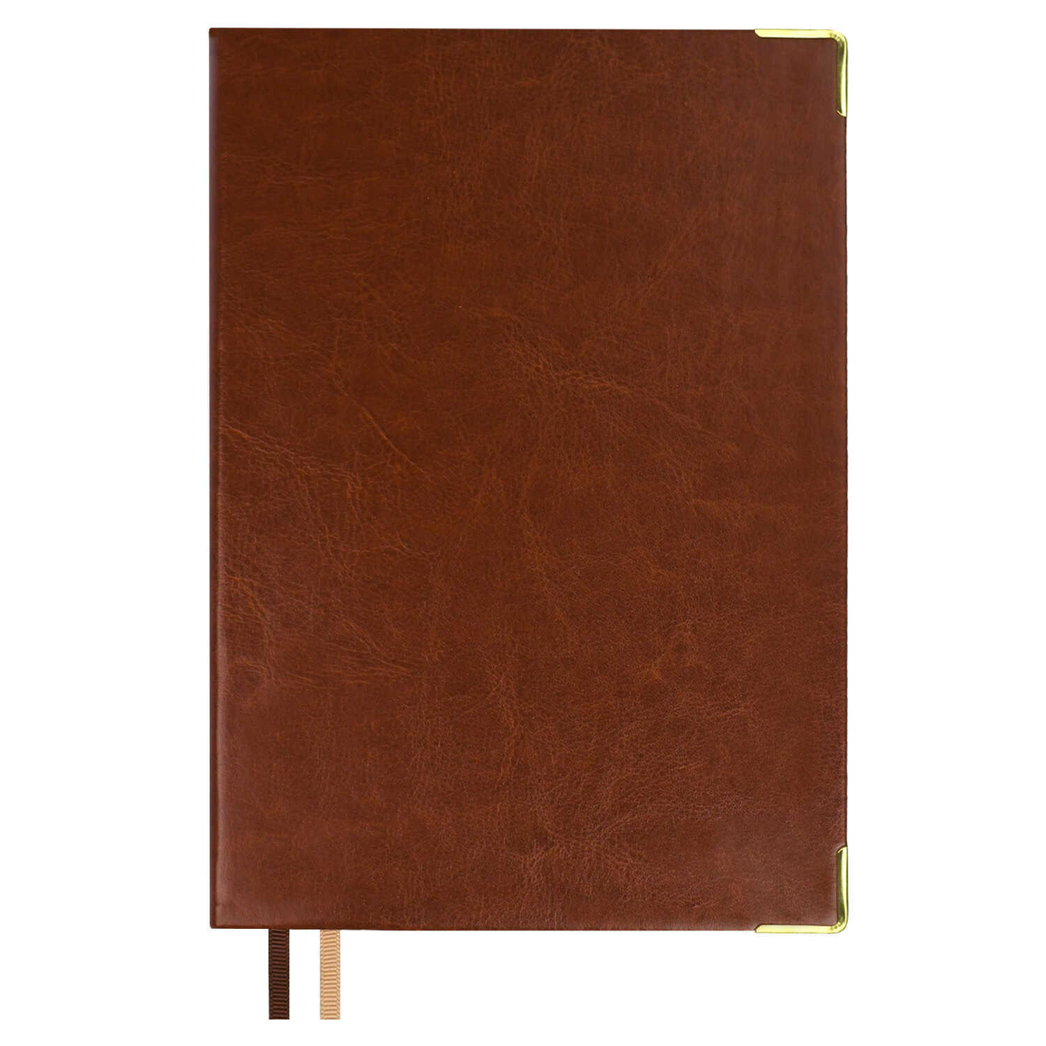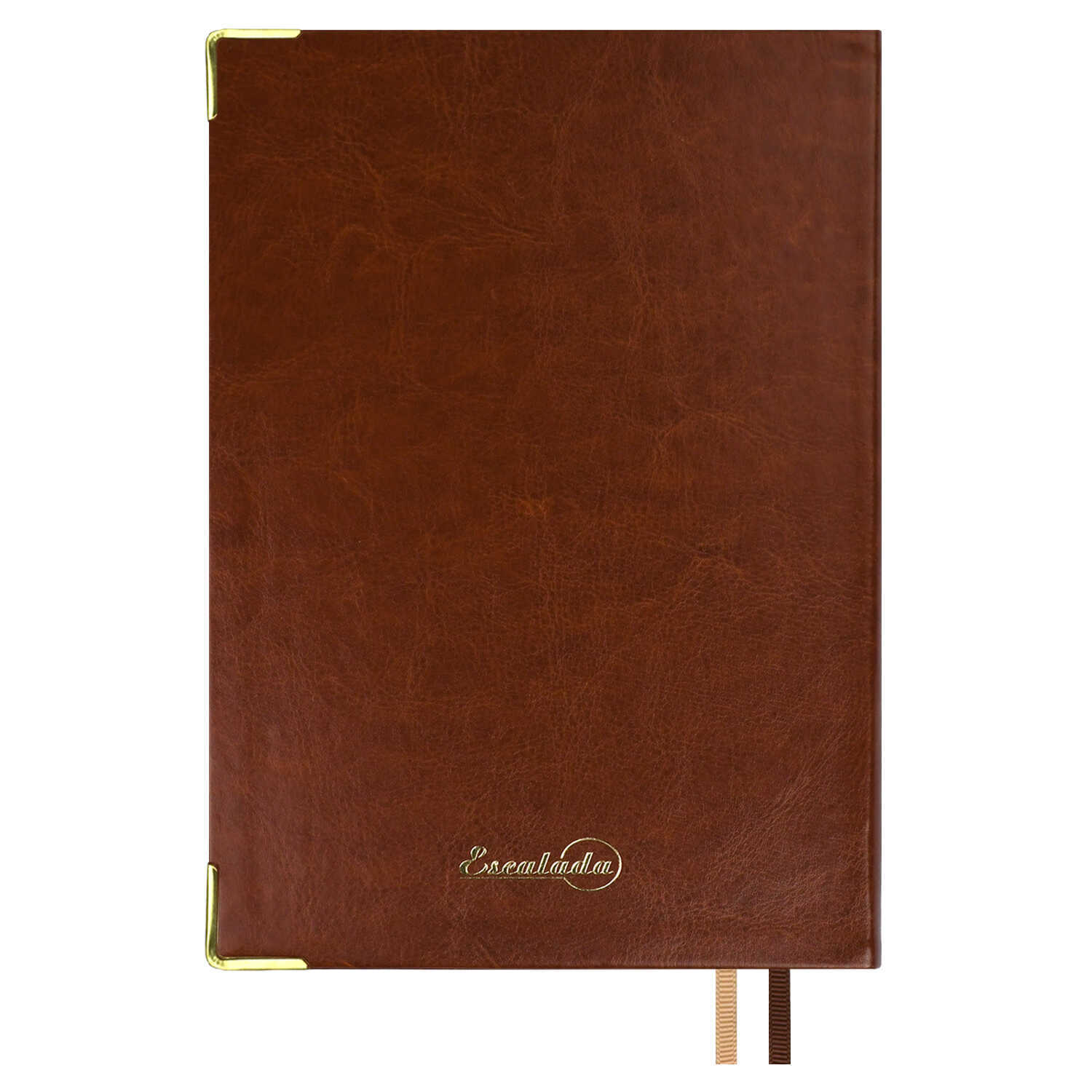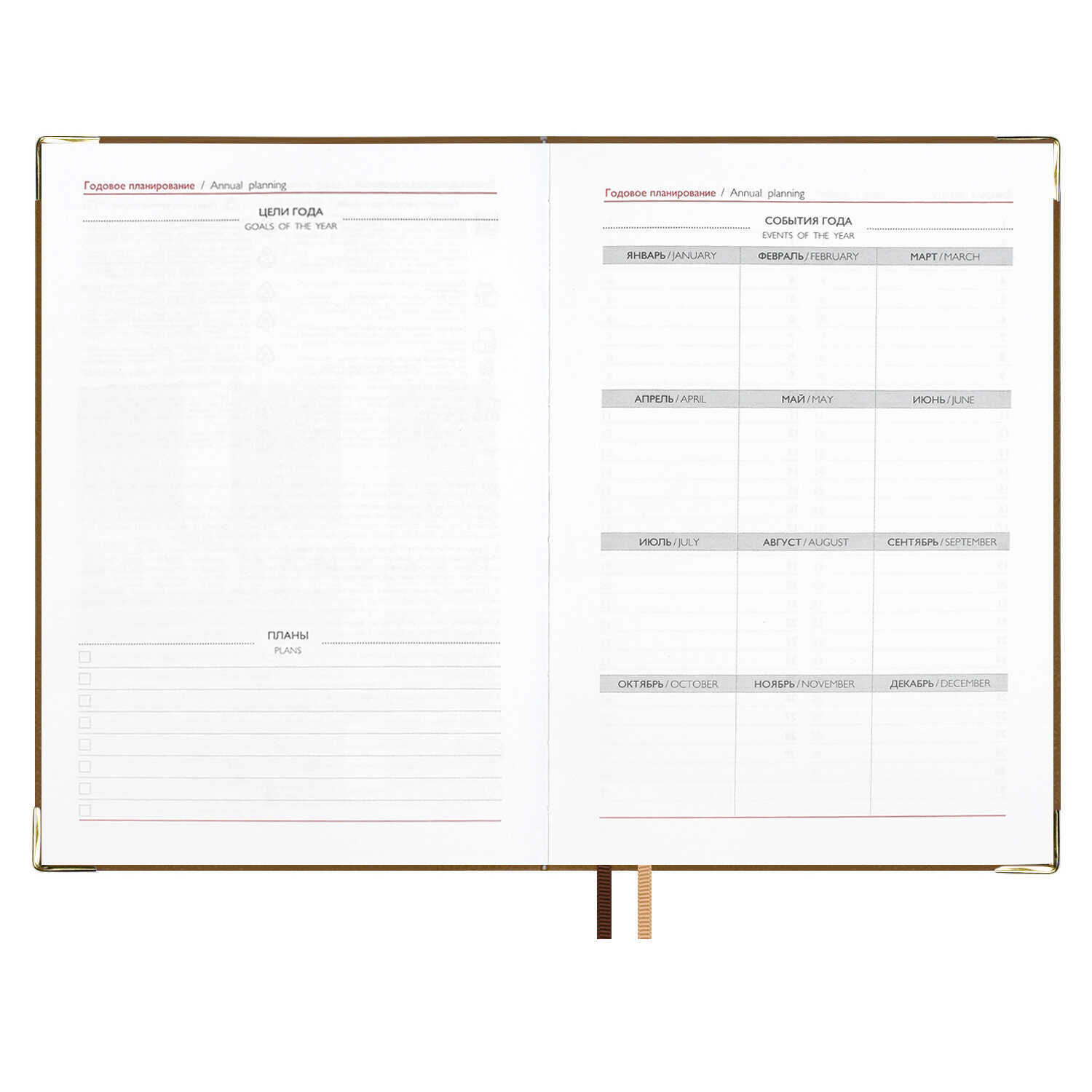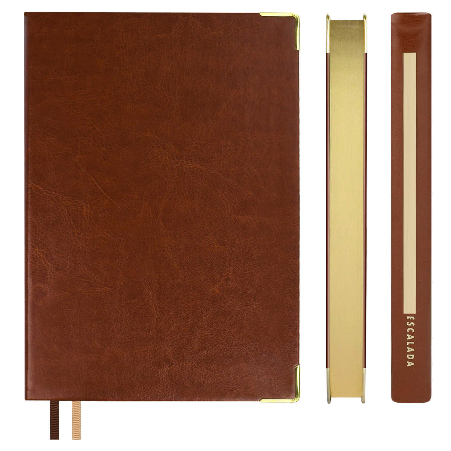 Ежедневник недатированный ESCALADA, #ДУМАЙ КАК МИЛЛИАРДЕР, А5, 160 л., арт. 70648/ 15 САРИФ КОРИЧНЕВЫЙ (кожзам: 146х211 мм, интегральный переплёт, материал обложки: искусственная кожа "Сариф"; способ крепления блока: ниткошвейный; декор: металлические уголки, тиснение фольгой; вн. блок: 160 л., белый офсет 70 г/м², печать в две краски (линия), справочный материал: есть; перфорация углов блока: нет; отделка среза: фольгирование; закладка/-и: два ляссе, каптал: есть; форзац: печать пантоном, особенности: в блоке использованы мотивирующие высказывания экстраординарной личности, предпринимателя и миллиардера, титулованного «Провидца века», шоумена и телеведущего, бывшего владельца конкурса красоты «Мисс Вселенная» и дважды президента США – Дональда Трампа
