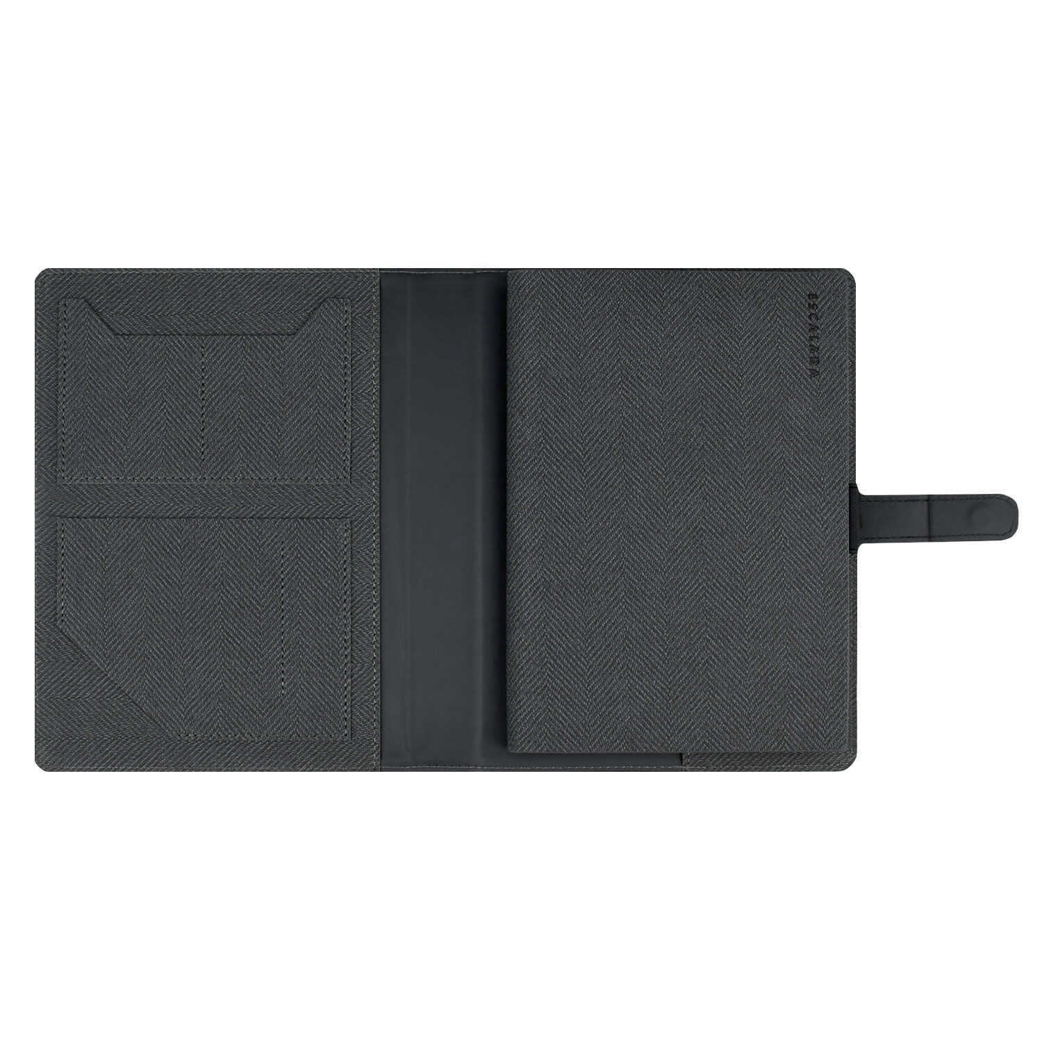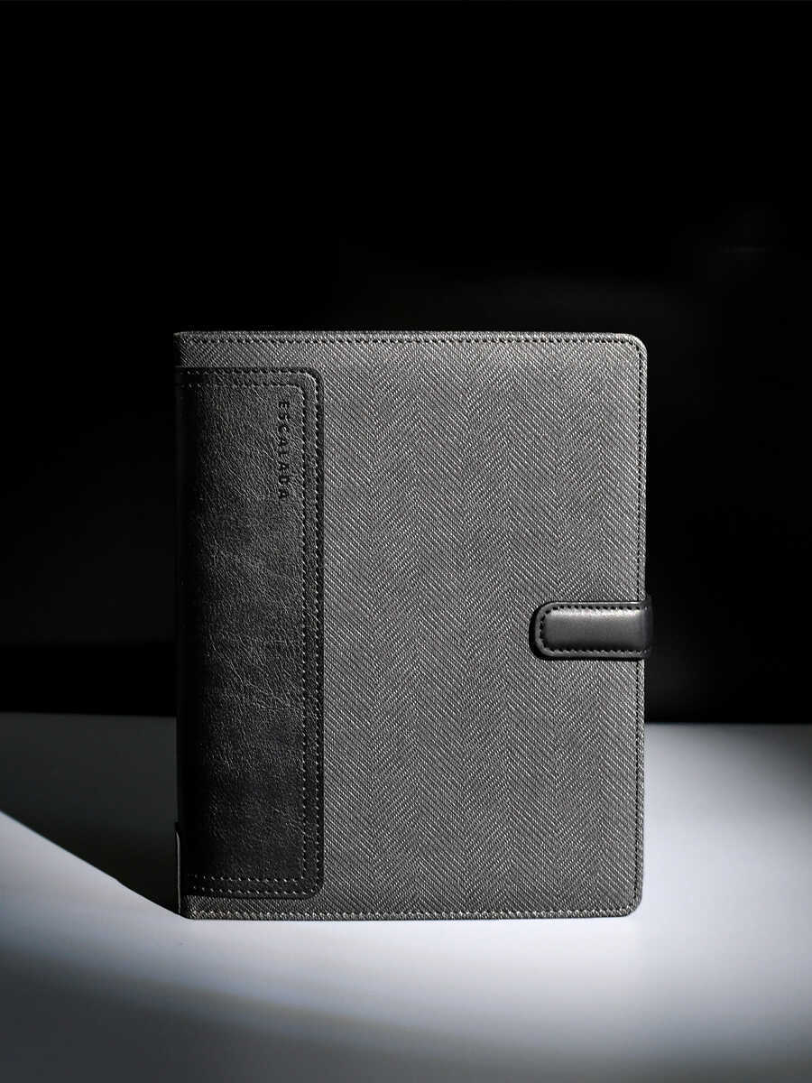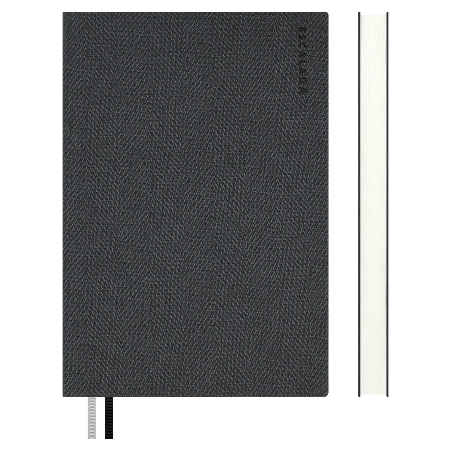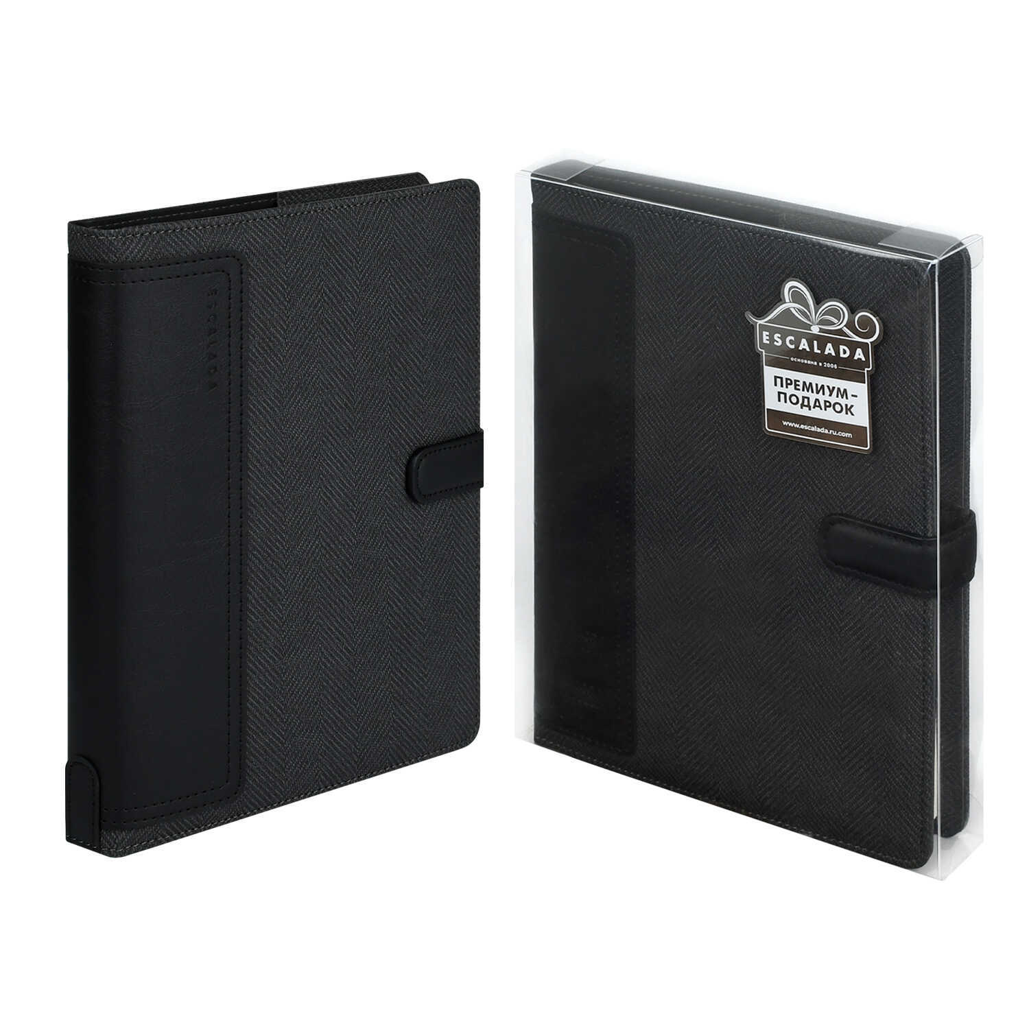 Ежедневник-органайзер недатированный ESCALADA, А5+, 160 л., арт. 70547/ 10 САРЖА ЧЁРНЫЙ (кожзам: 146х211 мм, 175x225 мм, твёрдый переплёт с поролоном, материал обложки: искусственная кожа "Буйвол", искусственная кожа "Саржа"; способ крепления блока: ниткошвейный; декор: аппликация из искусственной кожи, блинтовое тиснение; вн. блок: 160 л., кремовый офсет 70 г/м², печать в одну краску (линия), справочный материал: есть; перфорация углов блока: нет; закладка/-и: два ляссе, каптал: есть; форзац: печать пантоном, особенности: карманы внутренние, магнитный клапан фигурный, папка-органайзер в твёрдом переплёте с поролоном, ежедневник в мягком переплёте, петля для ручки; персонализация возможна: да; индивидуальная упаковка: ПВХ-коробка + промостикер + ПЭТ-пакет)