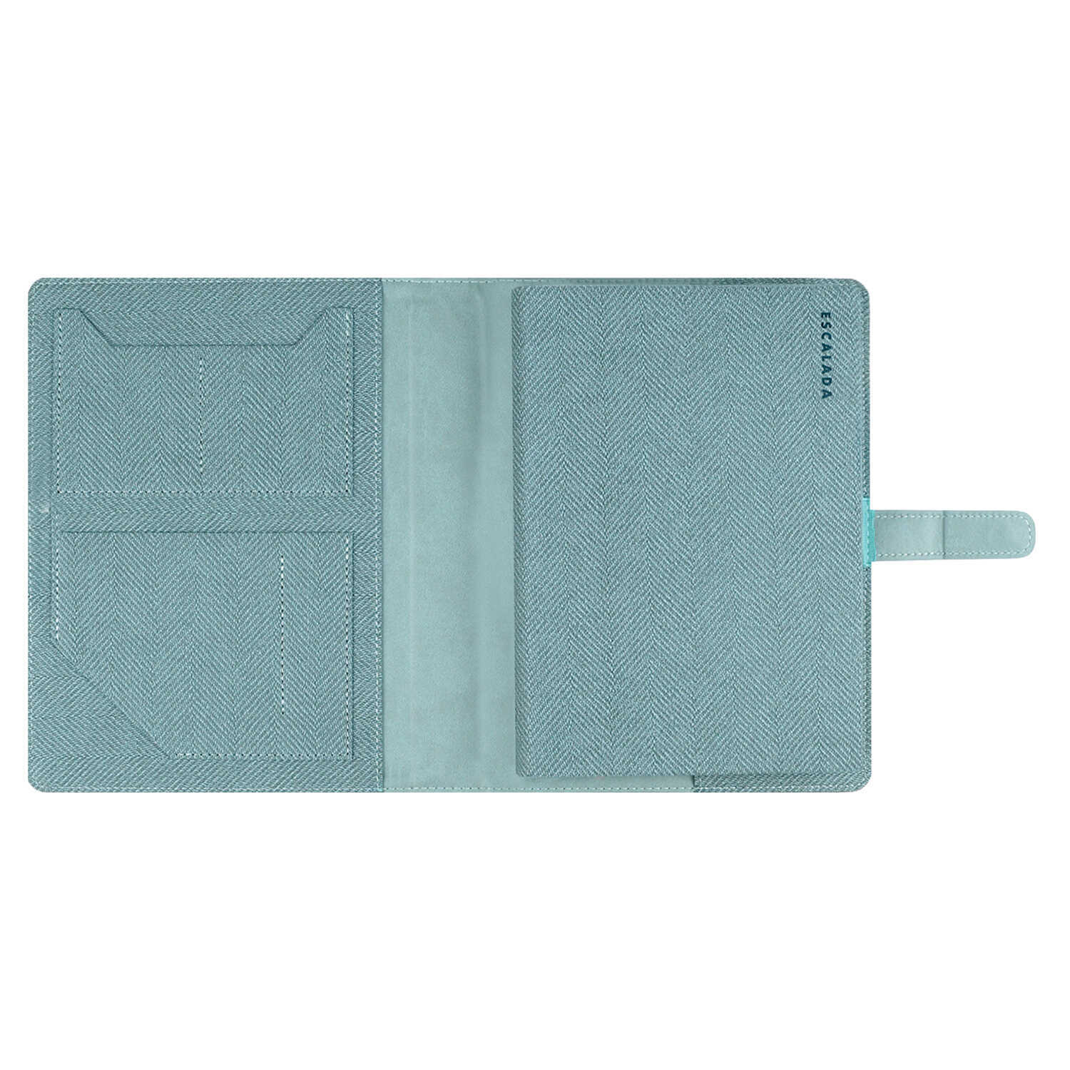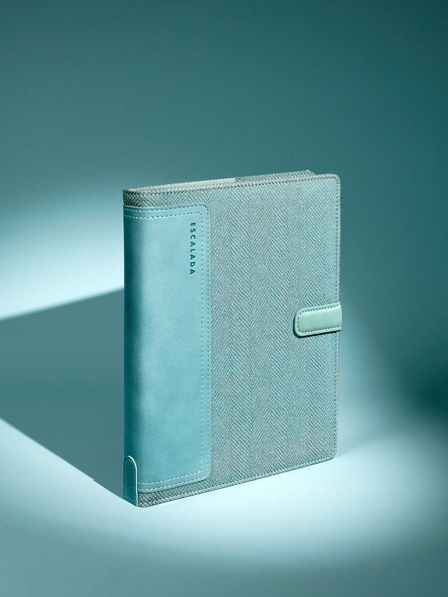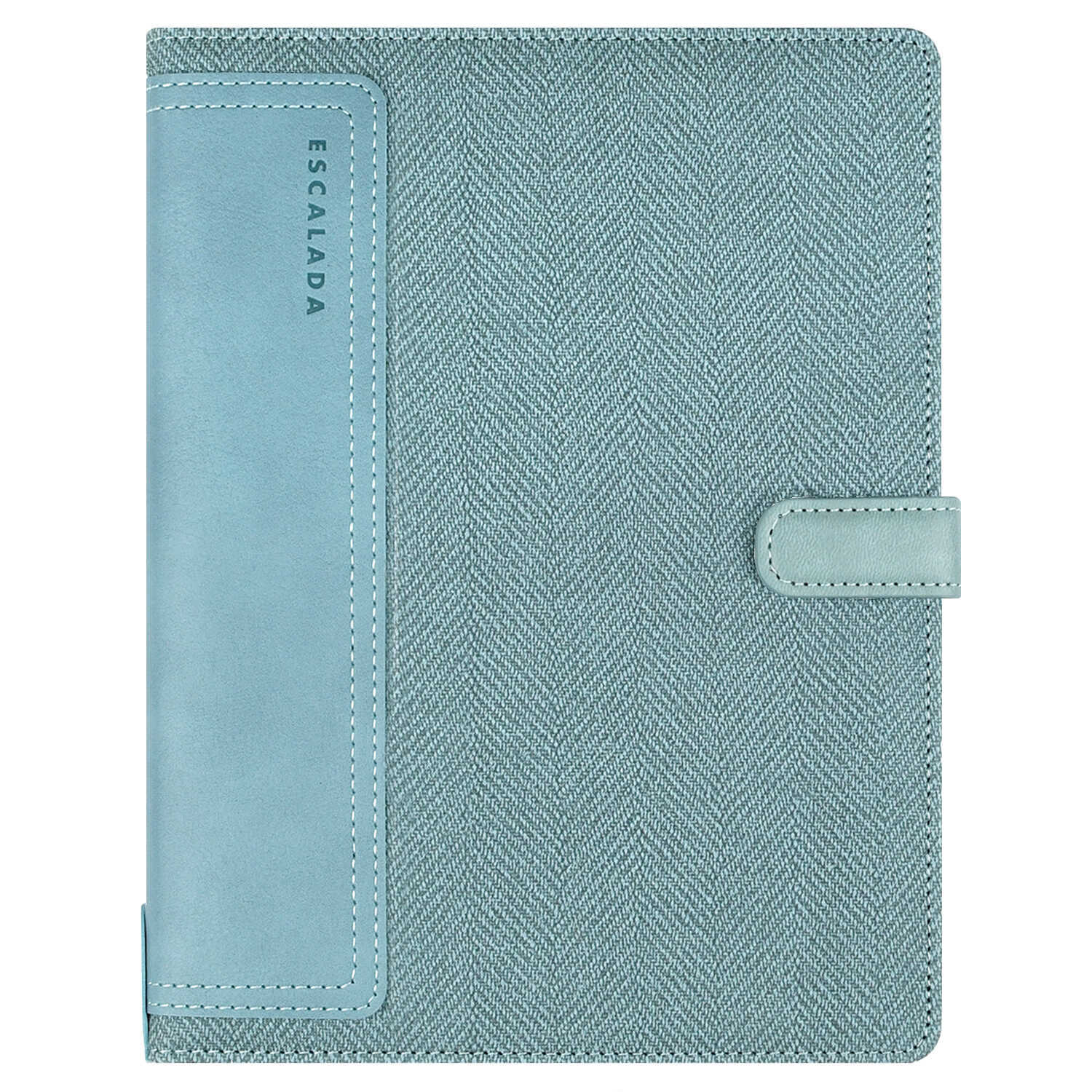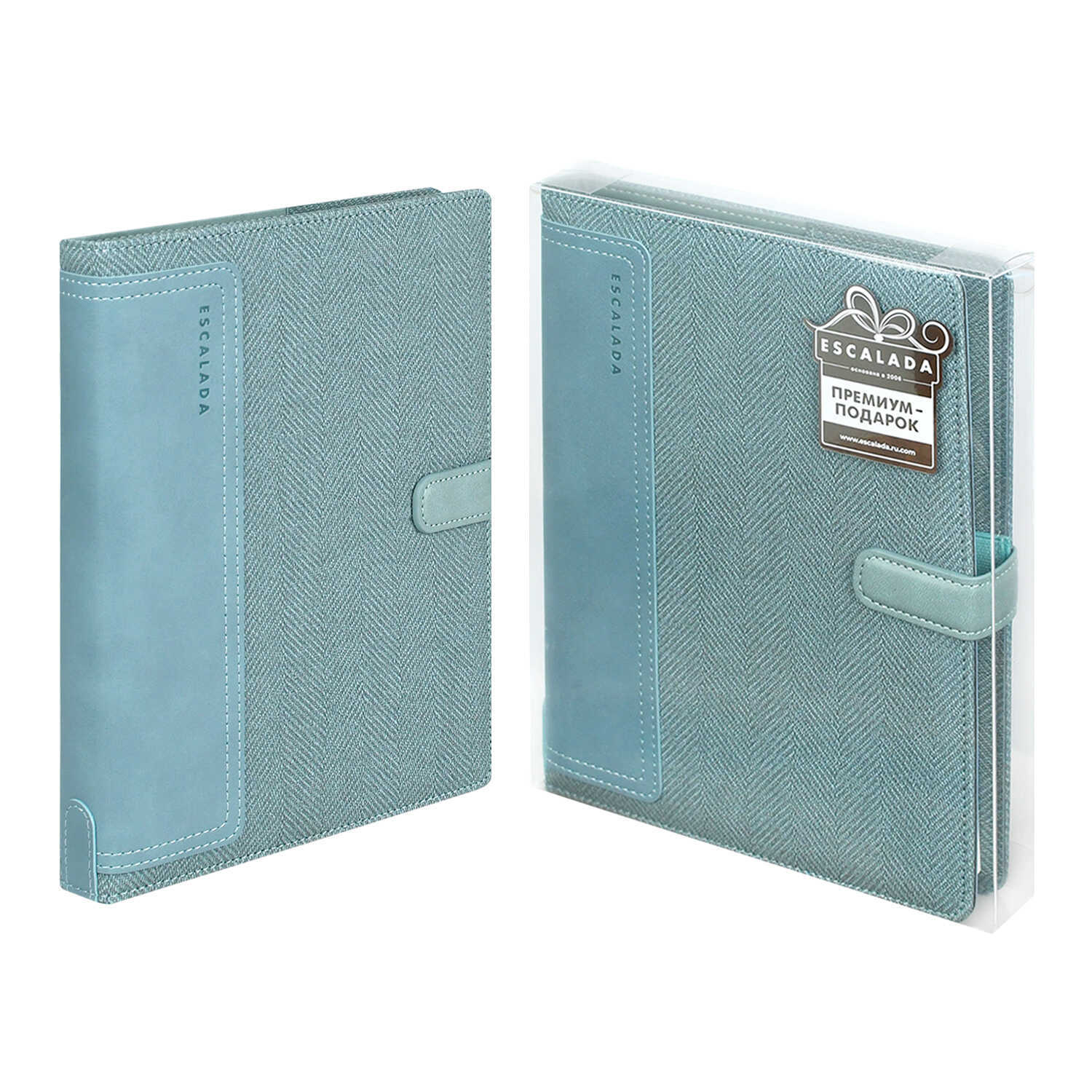 Ежедневник-органайзер недатированный ESCALADA, А5+, 160 л., арт. 70549/ 10 САРЖА ПЕПЕЛЬНО-ГОЛУБОЙ (кожзам: 146х211 мм, 175x225 мм, твёрдый переплёт с поролоном, материал обложки: искусственная кожа "Буйвол", искусственная кожа "Саржа"; способ крепления блока: ниткошвейный; декор: аппликация из искусственной кожи, блинтовое тиснение; вн. блок: 160 л., кремовый офсет 70 г/м², печать в одну краску (линия), справочный материал: есть; перфорация углов блока: нет; закладка/-и: два ляссе, каптал: есть; форзац: печать пантоном, особенности: карманы внутренние, магнитный клапан фигурный, папка-органайзер в твёрдом переплёте с поролоном, ежедневник в мягком переплёте, петля для ручки; персонализация возможна: да; индивидуальная упаковка: ПВХ-коробка + промостикер + ПЭТ-пакет)