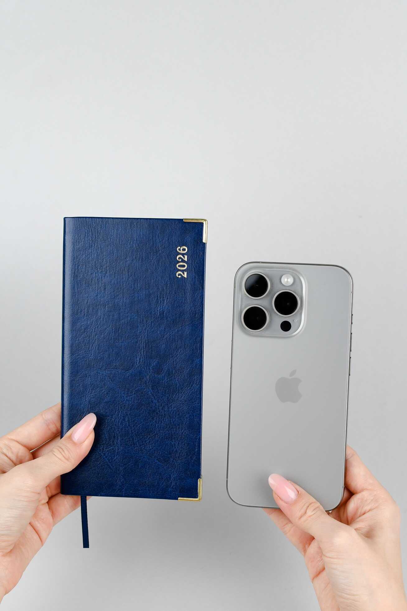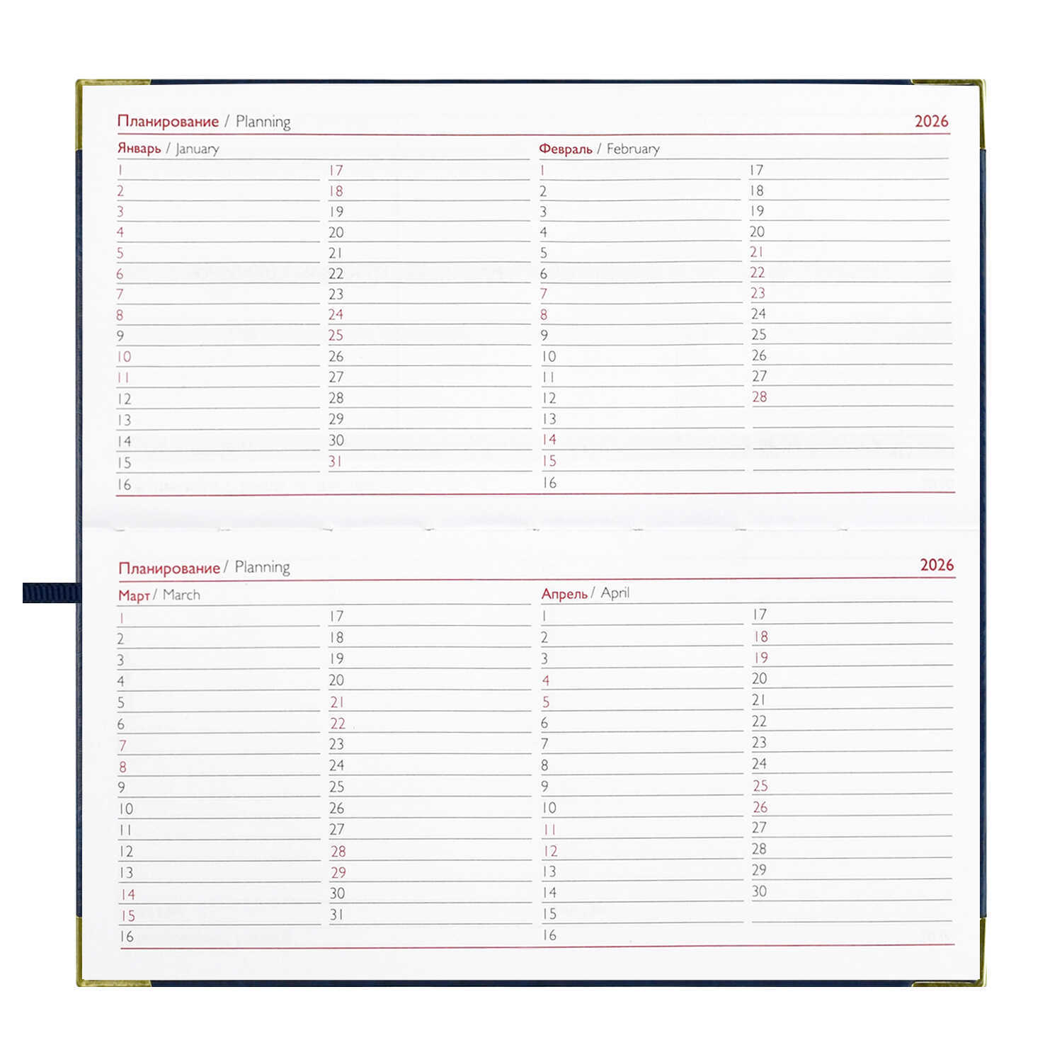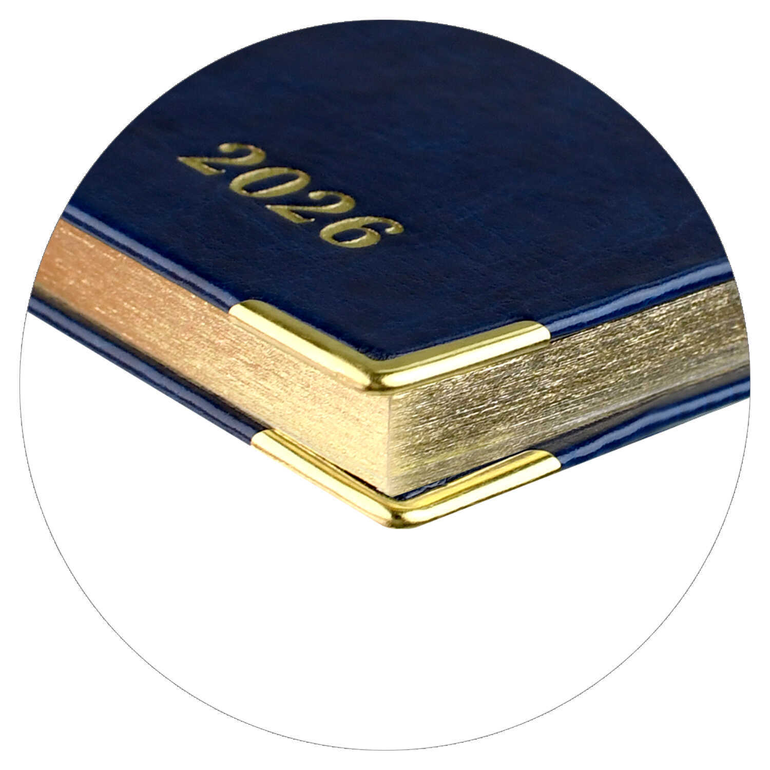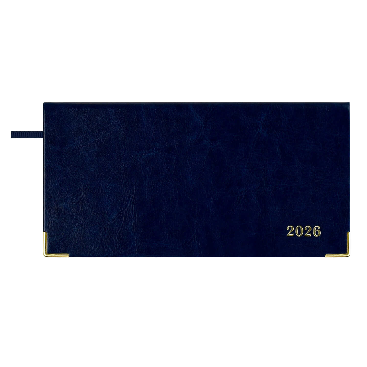 Еженедельник датированный 2026 ESCALADA, 170х88 мм, 64 л., арт. 70386/ 40 САРИФ СИНИЙ (кожзам: интегральный переплёт, материал обложки: искусственная кожа "Сариф"; декор: металлические уголки, тиснение фольгой; способ крепления блока: ниткошвейный; вн. блок: 64 л., белый офсет 70 г/м², печать в две краски (линия), справочный материал: есть; перфорация углов блока: нет; отделка среза: фольгирование; закладка/-и: одно ляссе; каптал: есть; форзац: печать пантоном; персонализация возможна: да; индивидуальная упаковка: ПЭТ-пакет)