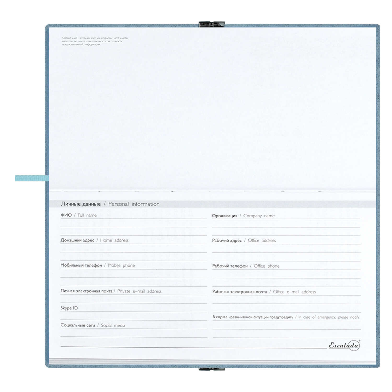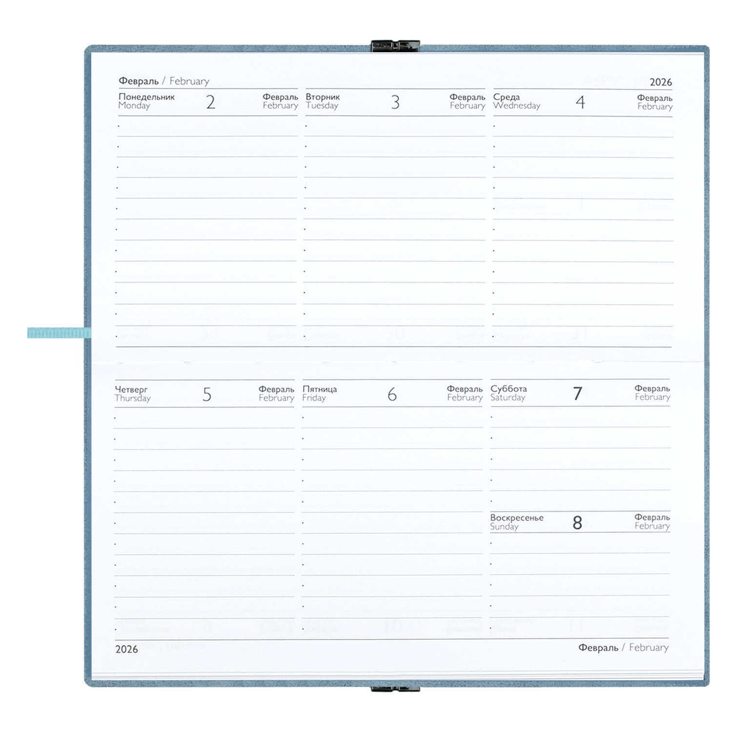 Еженедельник датированный 2026 ESCALADA, 175х95 мм, 64 л., арт. 70396/ 40 ТИВОЛИ ГЛОСС ГОЛУБОЙ (кожзам: мягкий переплёт, материал обложки: искусственная кожа "Тиволи глосс"; декор: блинтовое тиснение; способ крепления блока: ниткошвейный; вн. блок: 64 л., белый офсет 70 г/м², печать в одну краску (линия), справочный материал: есть; перфорация углов блока: нет; закладка/-и: одно ляссе; каптал: нет; форзац: печать пантоном; особенности: застёжка-резинка; персонализация возможна: да; индивидуальная упаковка: ПЭТ-пакет)