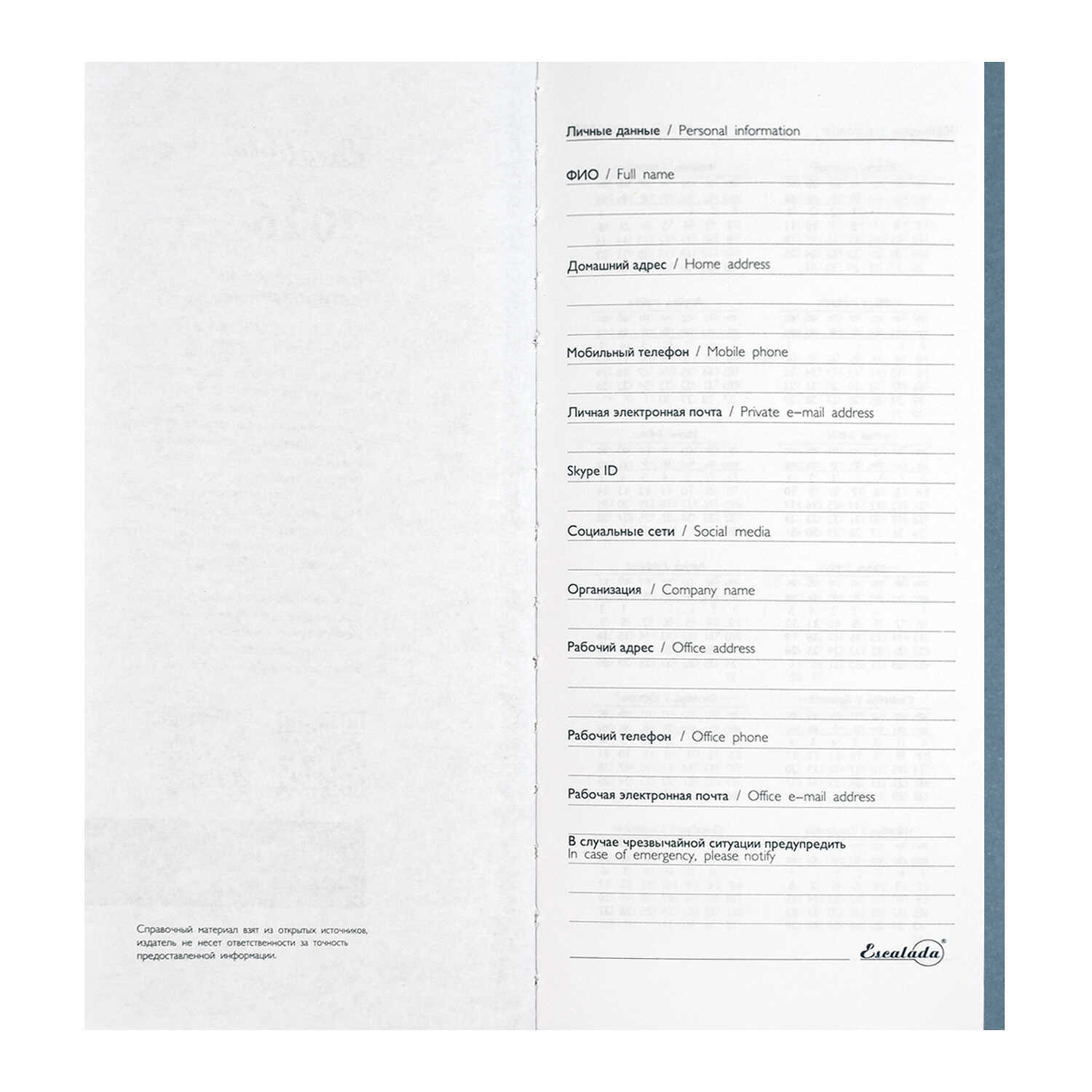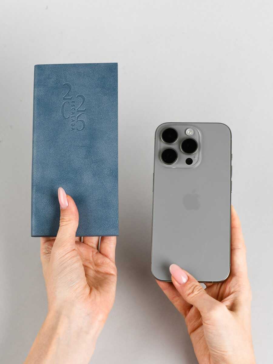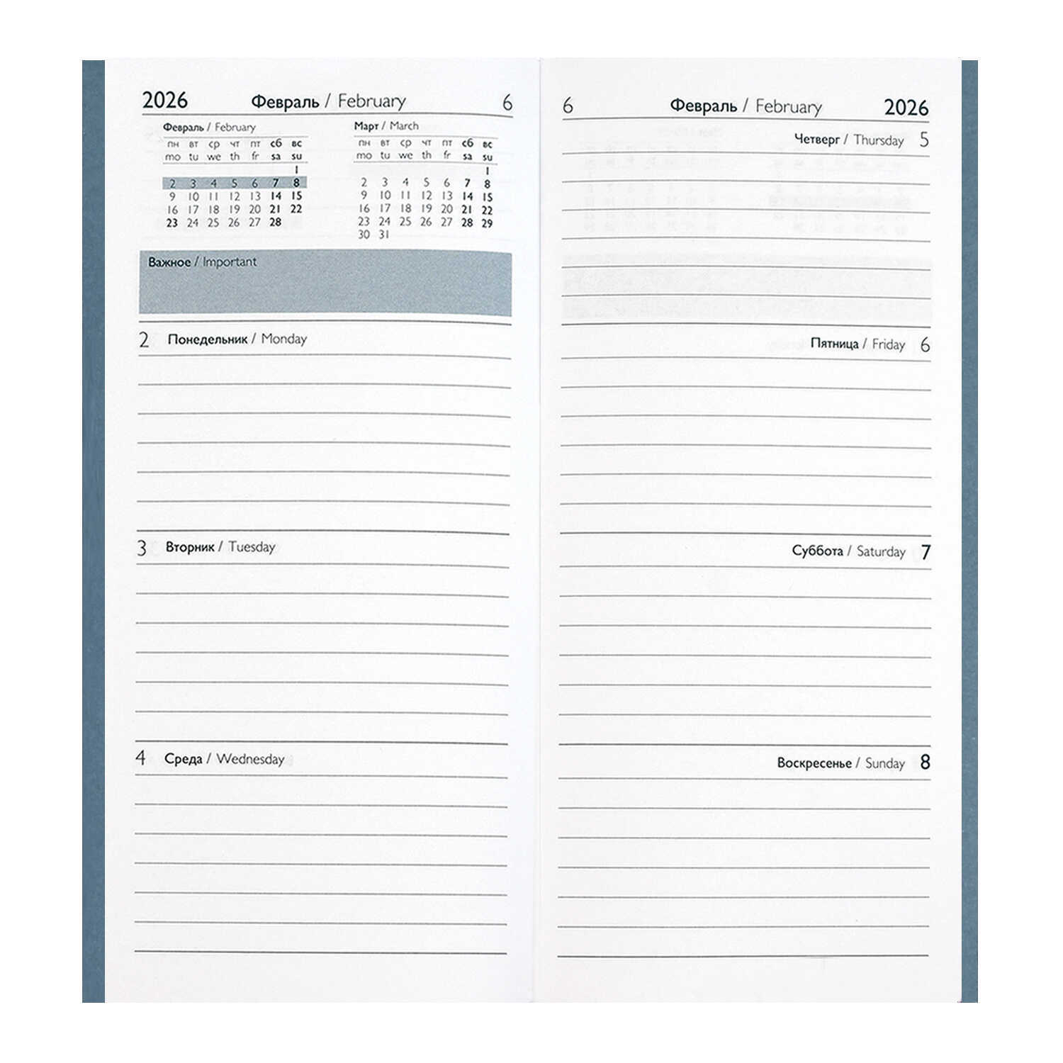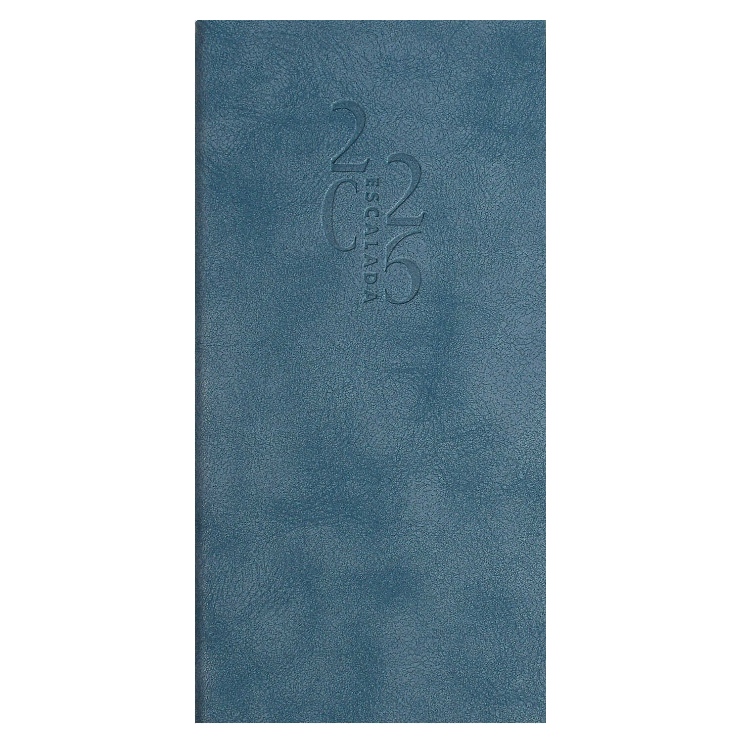 Еженедельник датированный 2026 ESCALADA, 80х165 мм, 64 л., арт. 70373/ 40 ТИВОЛИ ГЛОСС СИНИЙ (кожзам: мягкий переплёт, материал обложки: искусственная кожа "Тиволи глосс"; декор: блинтовое тиснение; способ крепления блока: ниткошвейный; вн. блок: 64 л., белый офсет 70 г/м², печать в одну краску (линия), справочный материал: есть; перфорация углов блока: нет; отделка среза: окрашивание пантоном; закладка/-и: нет; каптал: нет; форзац: печать пантоном; персонализация возможна: да; индивидуальная упаковка: ПЭТ-пакет)