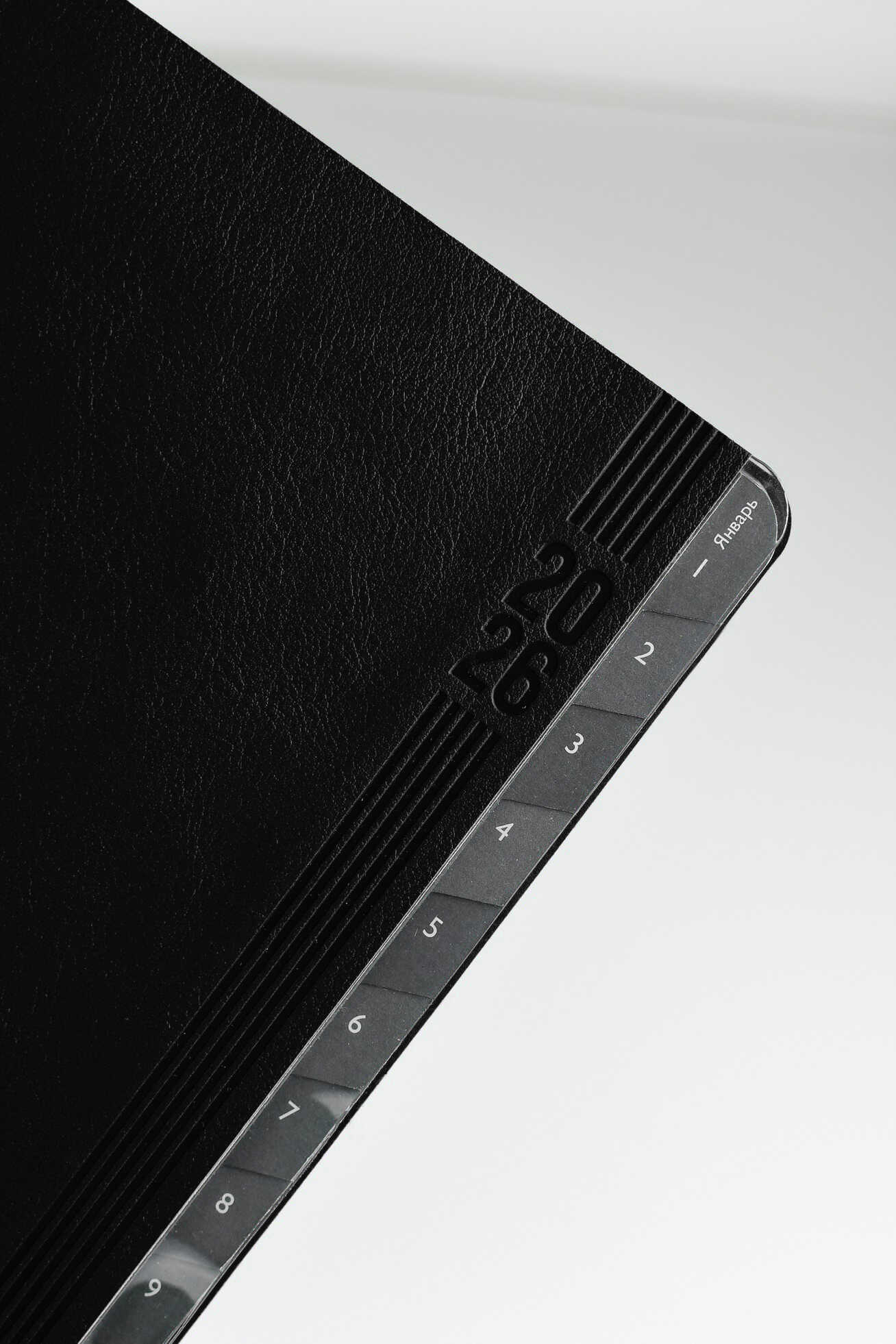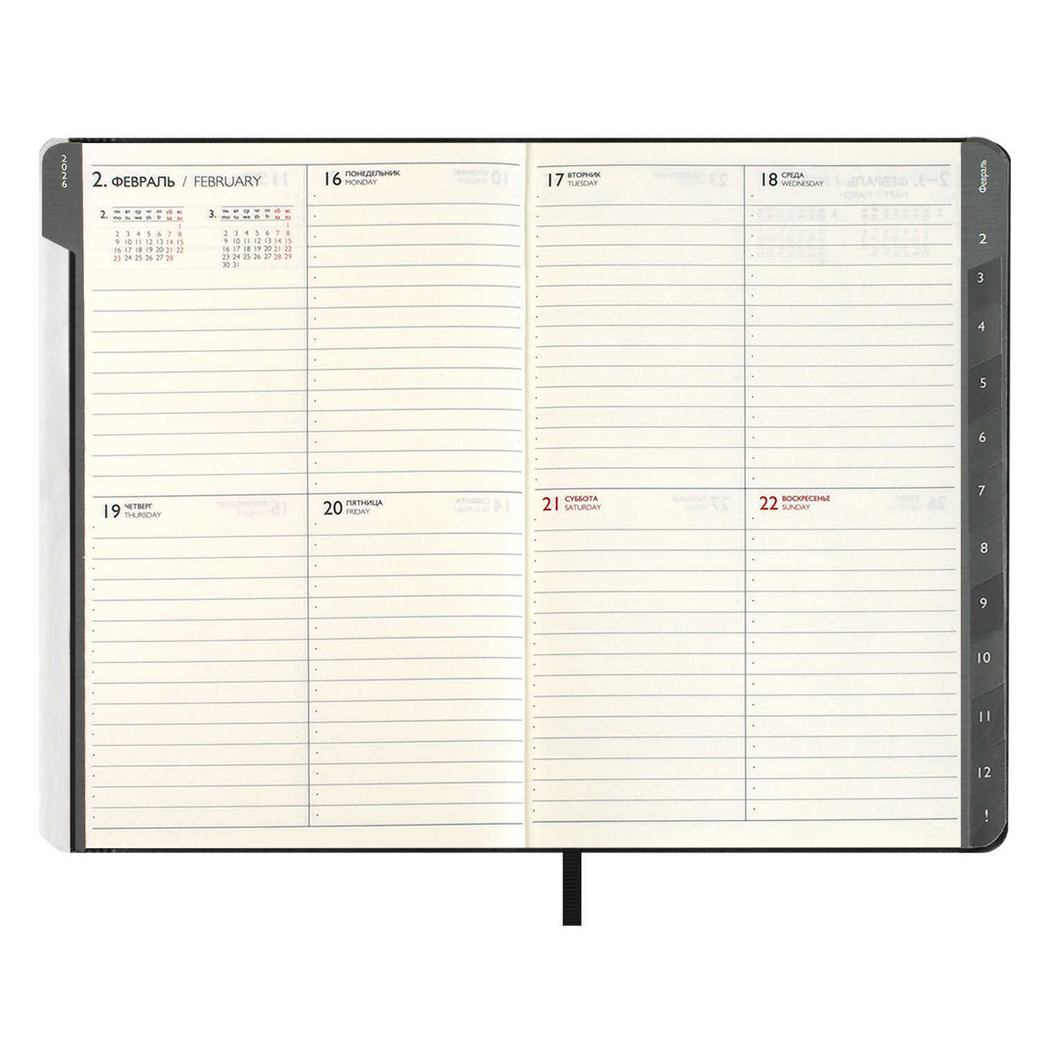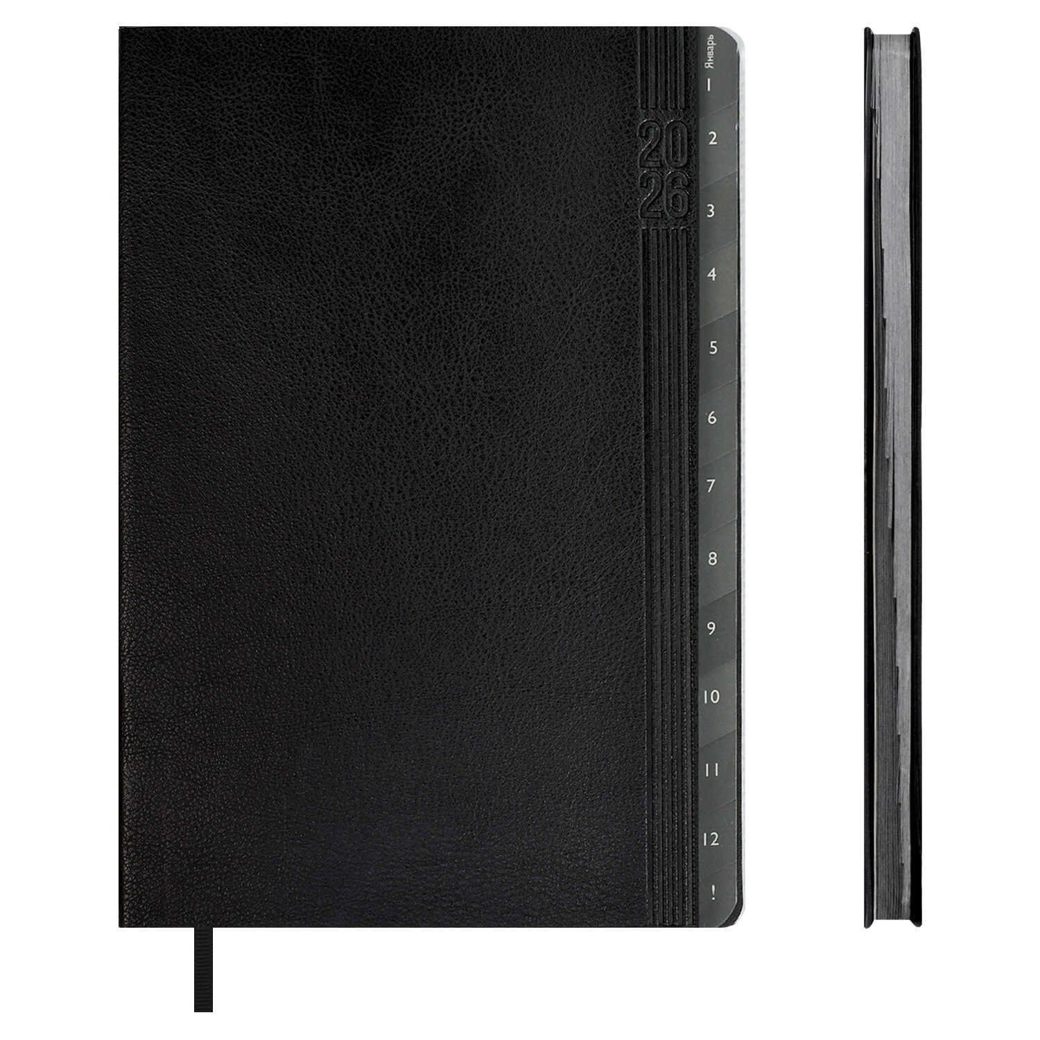 Еженедельник датированный 2026 ESCALADA, А5, 80 л., арт. 70334/ 15 БУЙВОЛ ЧЁРНЫЙ (кожзам: 149x211 мм, мягкий переплёт, материал обложки: искусственная кожа "Буйвол"; декор: блинтовое тиснение; способ крепления блока: ниткошвейный; вн. блок: 80 л., кремовый офсет 70 г/м², печать в две краски (линия), справочный материал: есть; перфорация углов блока: нет; закладка/-и: одно ляссе; каптал: есть; форзац: печать пантоном; особенности: комбинированные материалы, вырубка блока по месяцам; персонализация возможна: да; индивидуальная упаковка: промостикер + ПЭТ-пакет)