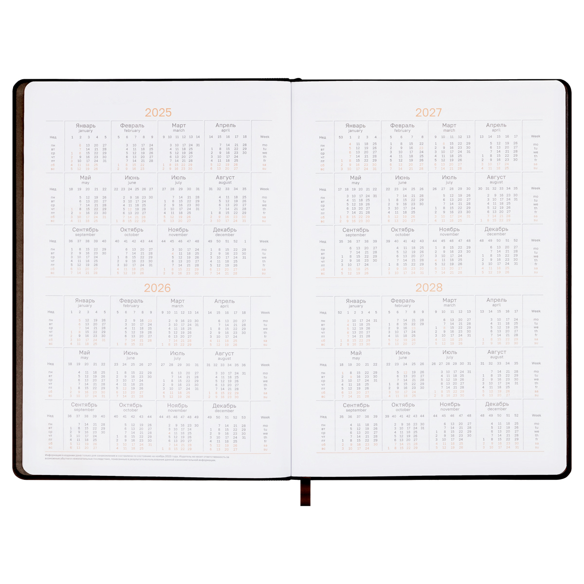 Содержит календарь на 4 года, дни рождения, место для постановки целей, а также помесячное планирование на год, листы для заметок и зарисовок. В комплекте с ежедневником идёт лист с наклейками для составления планов. Индивидуальная упаковка гарантирует его сохранность.