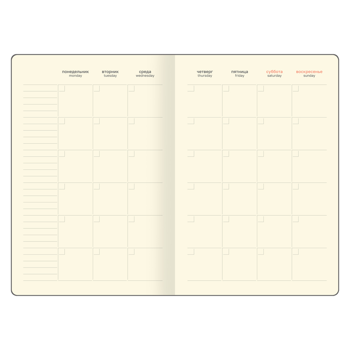 Еженедельник формата B5 размером 175*250 мм содержит 64 листа высококачественной кремовой бумаги повышенной плотности 70 г/м2 с пантонной печатью в 2 краски.
