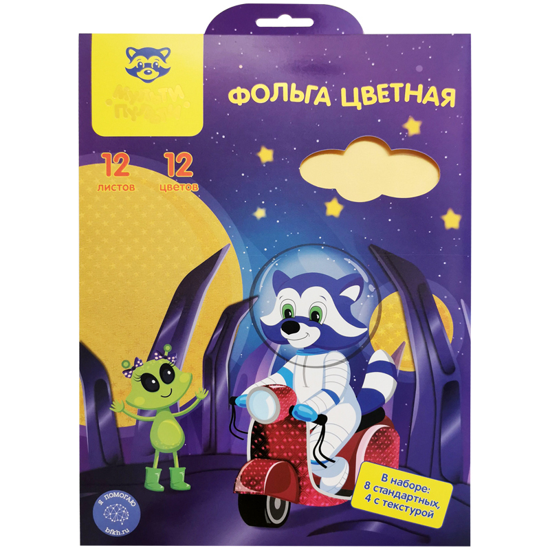 Фольга цветная A4, Мульти-Пульти "Енот в космосе", 12л., 12цв., в папке с европодвесом Ф12А4_38728 И
