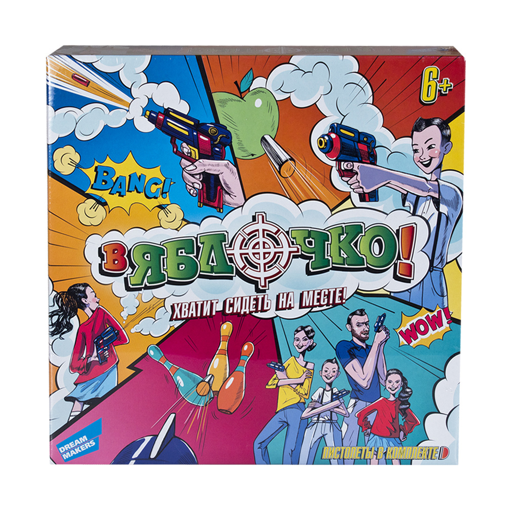 Простая и активная настольная игра Dream Makers "В яблочко!" для всей семьи. Игроки при помощи пистолетов пытаются попасть в одну из трёх, разнесенных на разное расстояние, мишеней. Мишени оформлены в забавном игровом стиле. Но прежде чем это сделать участникам необходимо выполнить определенное задание: встать на одну ногу, повернуться вокруг своей оси 3 раза, выстрелить не глядя. Всего в игре 24 оригинальных задания, которые имеют как командный, так и одиночный режим. Количество игроков: 2-4.Среднее время игры: от 20 минут.Возраст: 6+.В наборе: игровой пистолет - 3 шт.поролоновые пульки - 9 шт.карточки мишеней - 3 шт.игровые карточки - 24 шт.игровое полеправила игрыигральные фишки - 4 шт.