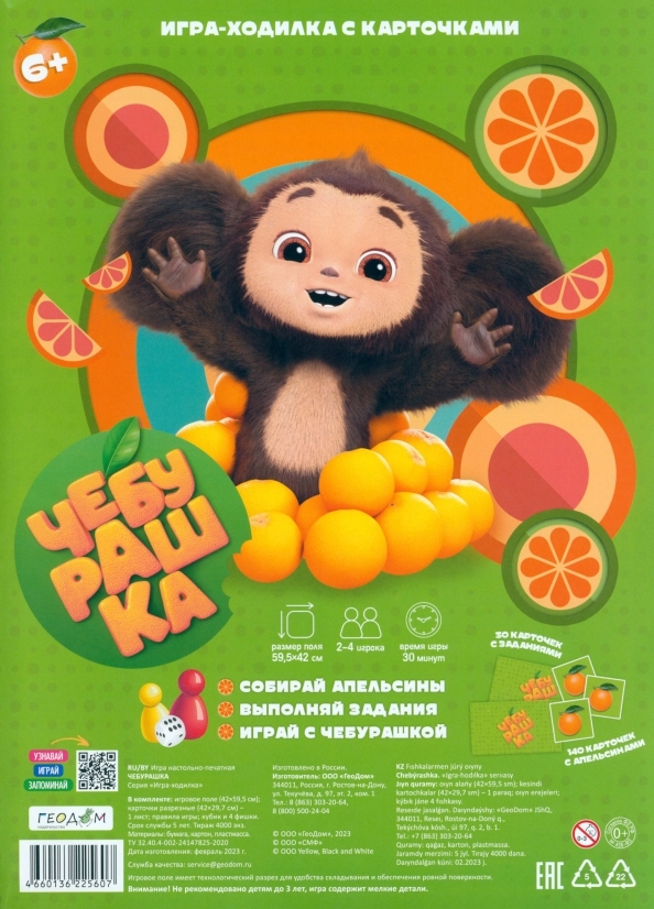 Урра, Чебурра...шка! Игра-ходилка – теперь с любимым героем! Бросай кубик, собирай и отдавай апельсинки, называй слова на буквы Ч, Е, Б, У, Р, А, Ш, К, А – и принеси в своей корзинке больше всего апельсинов. Игра развивает мелкую моторику, скорость реакции, учит быть внимательным, идти к цели и побеждать. Игра выпущена по лицензии. Рекомендованный возраст 6+, количество игроков - 2-4.
