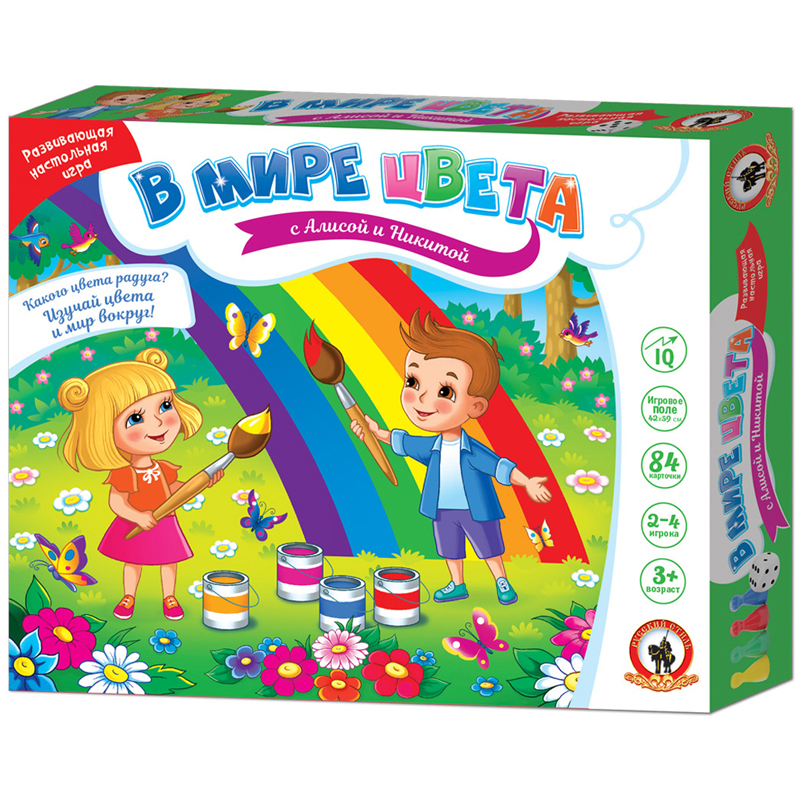 Весёлые друзья Алиса и Никита приглашают отправиться в увлекательное путешествие в мир цвета! Играя в эту развивающую игру, малыши познакомятся с цветами радуги, узнают, какого цвета бывают предметы и животные вокруг нас, научатся объединять их в группы по цветовому признаку. В комплекте: игровое поле – 1 шт., карточки – 84 шт., фишки – 4 шт., кубик – 1 шт., правила игры.