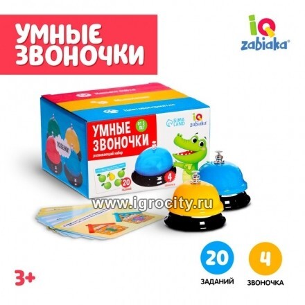 Развивающий набор станет любимой игрушкой вашего ребёнка. В нём малыш обнаружит 4 цветных звонких колокольчика. Они помогут ему запомнить цвета, цифры, научиться считать и решать много полезных заданий с карточек!Как играть?Попросите кроху расставить все колокольчики в один ряд и рассказать, какого они цвета.Возьмите карточку, прочитайте задание вслух. Пусть малыш выполнит его.Если будут сложности, помогите ребёнку скорее прийти к правильному ответу.Фантазируйте и придумывайте для малыша свои задания на смекалку и внимание.Игра развивает логику, цветовосприятие, фантазию и обучает счёту. Набор рекомендован детям старше 3 лет.Играйте и развивайтесь вместе с IQ-ZABIAKA!ДополнительноРекомендовано детям старше 3 лет.Комплектация10 двусторонних крточек: 10 × 8 см.Колокольчики, 4 шт.: 6,6 × 6,5 × 4,5 см.