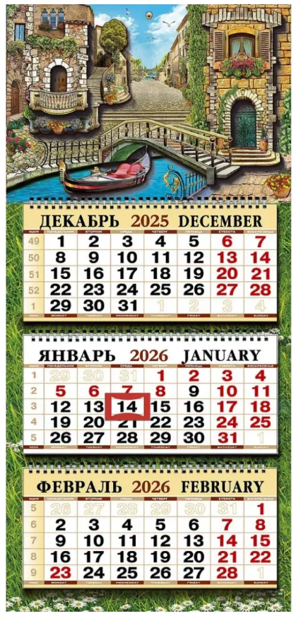Верхние топ-слайды с белым оборотом покрыты УФ лаком. Календарь скреплен тремя металлическими гребнями. Каждый календарь упакован в в пакет с еврослотом.