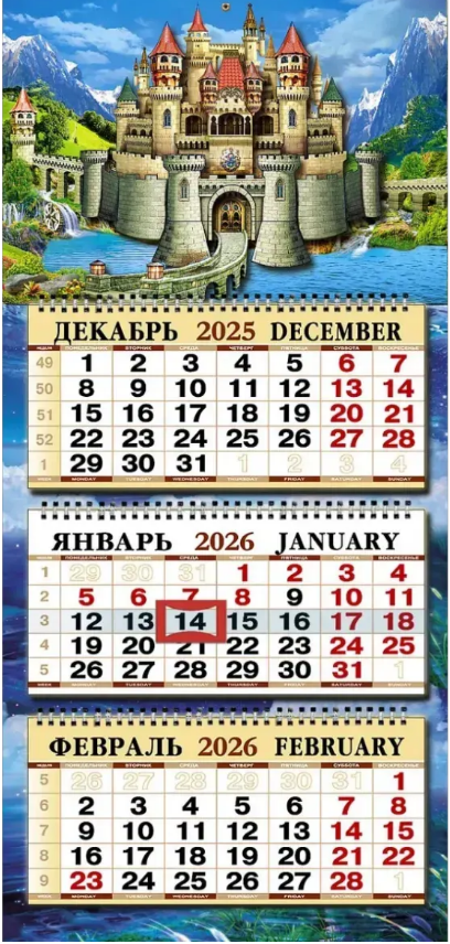 Верхние топ-слайды с белым оборотом покрыты УФ лаком. Календарь скреплен тремя металлическими гребнями. Каждый календарь упакован в в пакет с еврослотом.