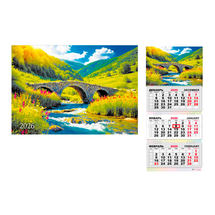 Размер: 300×690 мм, Шпигель: 300×210 мм, Календарный блок: 300×140 мм. Подложки: 300х160 мм. Материал: Шпигель: картон, 270–300 г/м2 Блоки: офсетная бумага, 80 г/м2 Печать: Шпигель: офсетная 4+0 (полноцветная односторонняя) Блоки: офсетная 2+0 (двухкрасочная односторонняя) Крепление: 3 метал. пружины для крепления блоков
