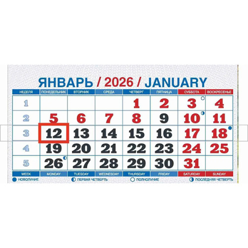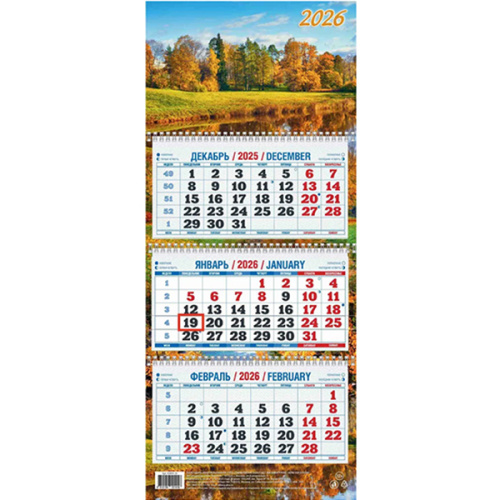 Настенный квартальный трёхблочный календарь с курсором, формат 195х465 мм, в индивидуальной упаковке (европакет с подвесом). Состоит из красочного постера на мелованном картоне плотностью 250 г/м2, покрытого глянцевым УФ лаком, трёх календарных блоков с нумерацией недель, запечатанных в 2 краски на офсетной бумаге плотностью 60 г/м2 и расположенных на красочных полноцветных подложках на мелованном картоне плотностью 200 г/м2. Календарь скреплён тремя металлическими гребнями, крепится на стену при помощи кольца (пикколо).