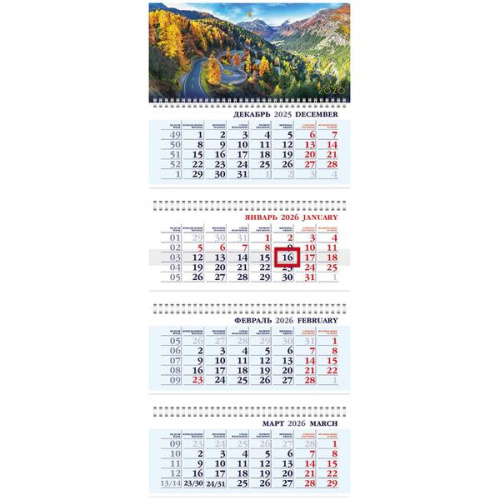 Календарь квартальный на 2026 год. Календарь состоит из 4 блоков, на 4 гребнях. Бегунок в наличии. Блоки из офсетной бумаги с двухцветной печатью. Размеры: 297х755мм.