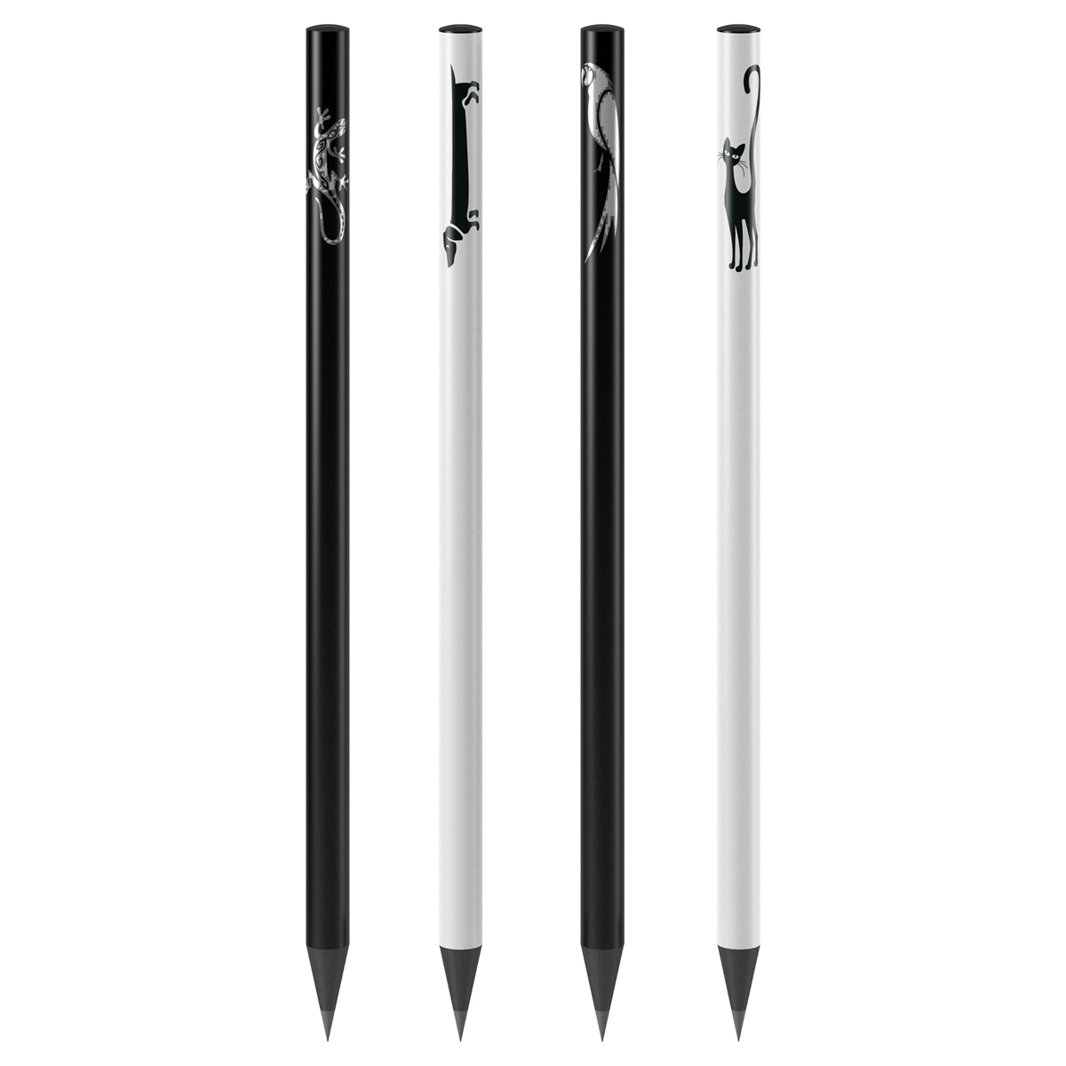 Чернографитный карандаш из черного дерева, с заточкой. Подходит для черчения и рисования. Диаметр грифеля 2,2мм, твердость HB, круглая форма, штрих-код на корпусе. Контрастная черно-белая печать на корпусе силуэтами животных, ассорти 4 дизайна. Упаковка в тубу по 72шт.