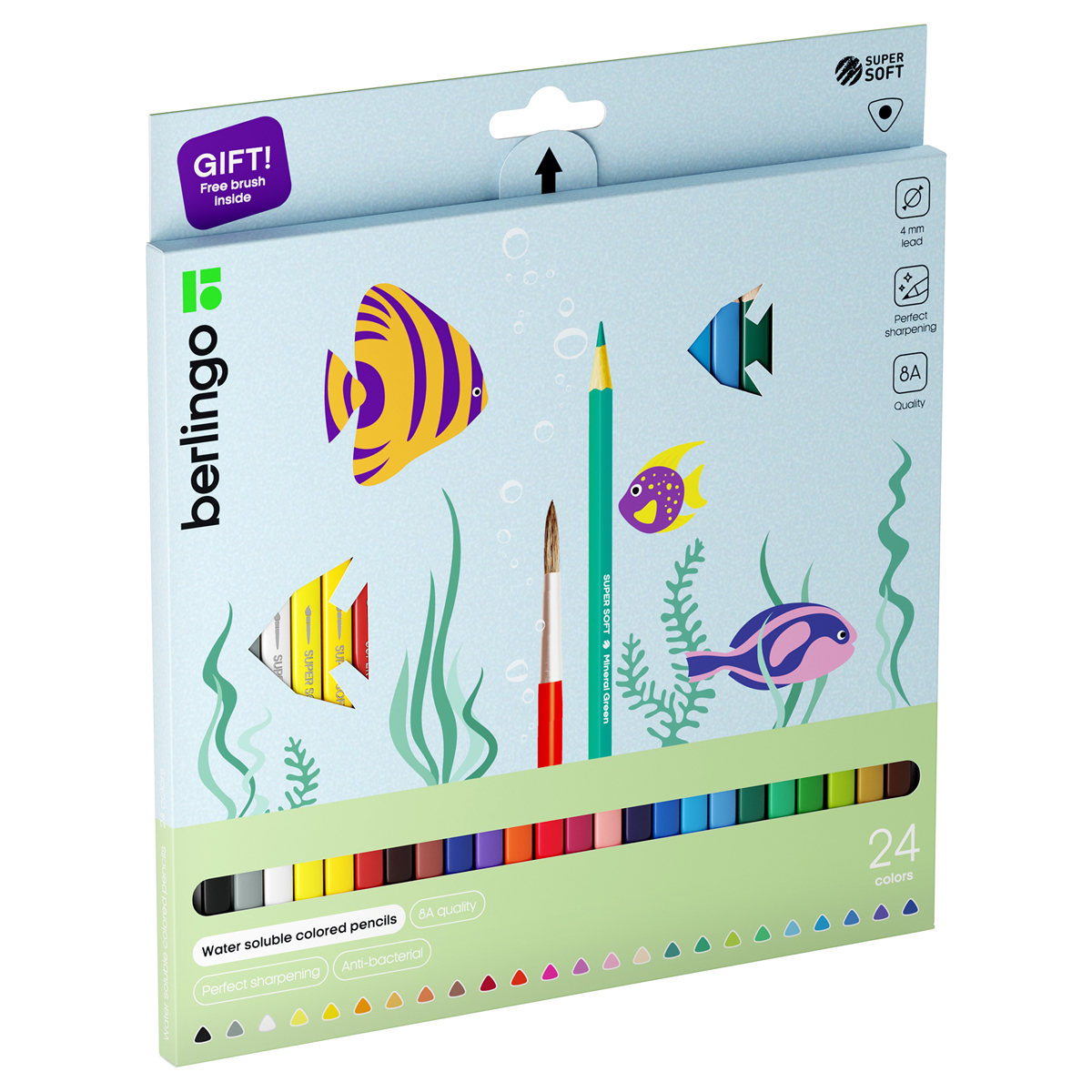 "SuperSoft" - линейка качественно новых цветных карандашей Berlingo. Акварельные карандаши Berlingo обладают идеальной растворимостью, отличной смешиваемостью, мягким письмом и яркими красками. 24 цвета. Кисть в комплекте. Эргономичная трехгранная форма. Указание цвета на каждом карандаше на английском языке. Поле для подписи имени владельца на каждом карандаше. Упаковка в плотную матовую картонную коробку со склеенным европодвесом. Пластиковый трей внутри предотвращает скатывание карандашей и позволяет легко собирать их в коробку.