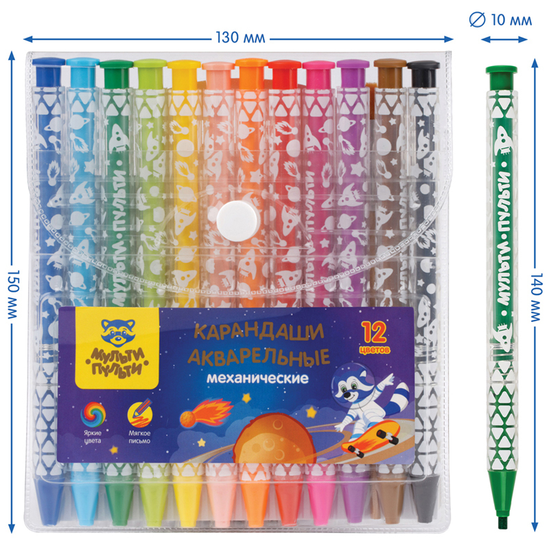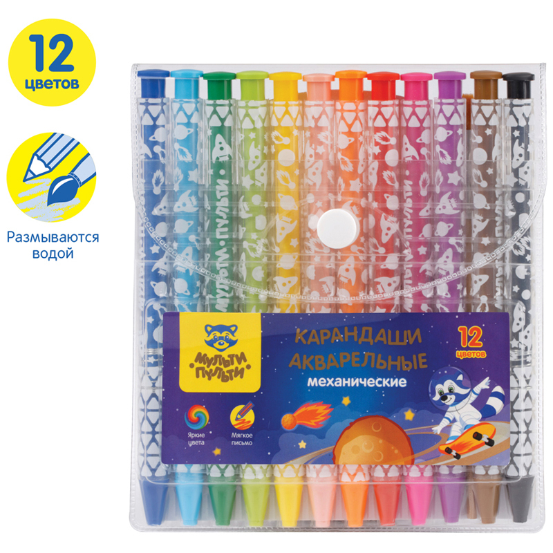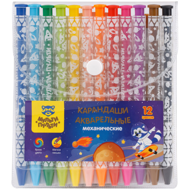 Карандаши акварельные механические от Мульти-Пульти - отличное решение для творческих экспериментов ребенка. Благодаря механическому узлу карандаша грифель можно выдвинуть нажатием на кнопку, точилка для такого карандаша не требуется. Грифель толщиной 3мм обладает акварельным эффектом - это значит, что карандаш можно использовать не только для обычного рисования, но и применяя акварельные техники. Нарисованный рисунок можно размыть водой, получив эффект акварели, кисть входит в состав набора. Также можно рисовать по мокрой бумаге или намочив грифель в воде. Для стартовых экспериментов в набор включены 5 листов для раскрашивания.