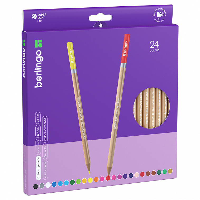 Цветные карандаши Berlingo SuperSoft. Pro идеально подойдут для творчества. SuperSoft. Pro – премиальная линейка цветных карандашей Berlingo высшего качества. В наборе 24 ярких насыщенных цвета, обладающих превосходной смешиваемостью. Цвет на каждом карандаше указан на английском языке.В карандашах используется грифель высочайшего стандарта качества 8А, являющегося максимальным для нехудожественных цветных карандашей. Безупречное и комфортное раскрашивание обеспечивает увеличенная до 4 мм толщина грифеля. При производстве грифеля использована уникальная формула и технология, в результате которых достигается одновременно удивительная мягкость письма и прочность, позволяющая изделию выдерживать даже сильное нажатие под углом 45 градусов. Мягкость письма можно сравнить с рисованием маслом и пастелью. Карандаши стойкие к повреждениям – специальная проклейка предотвращает поломку грифеля при падении. Круглый корпус диаметром 7 мм выполнен из древесины высшего качества, прошедшей тщательную обработку. Материал, сохраняющий свою прочность и легко поддающийся ровной заточке без усилий. Уникальная антибактериальная обработка на специализированном оборудовании гарантирует безопасное использование продукции детьми.Карандаши упакованы в плотную матовую картонную коробку с покрытием soft-touch и склеенным европодвесом. Пластиковые подложки-треи черного цвета помогут хранить карандаши на столе. В подарок в каждой упаковке есть карта цветов на художественной бумаге для выкрасов и теста смешиваемости.• Количество цветов: 24;• Материал корпуса: дерево;• Форма корпуса: круглая