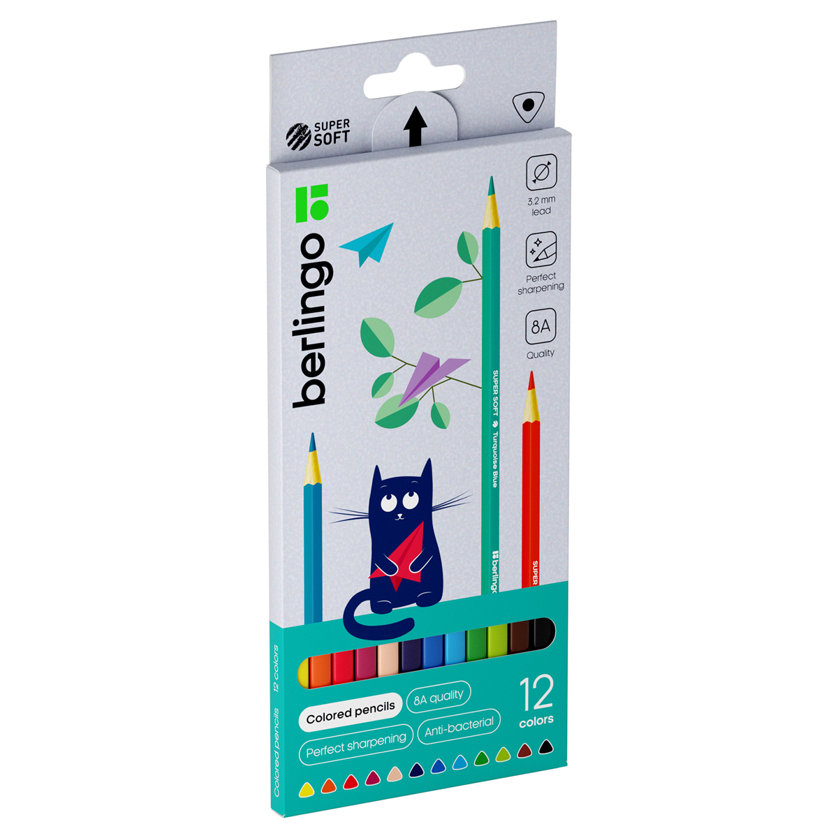 "SuperSoft" - линейка качественно новых цветных карандашей Berlingo. 12 цветов. Эргономичная трехгранная форма. Указание цвета на каждом карандаше на английском языке. Поле для подписи имени владельца на каждом карандаше. Упаковка в плотную матовую картонную коробку со склеенным европодвесом.