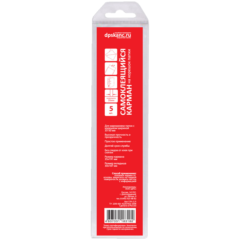 Предварительно снимите защитную бумажную поверхность, наклейте карман на корешок папки, вложите листок с информацией.