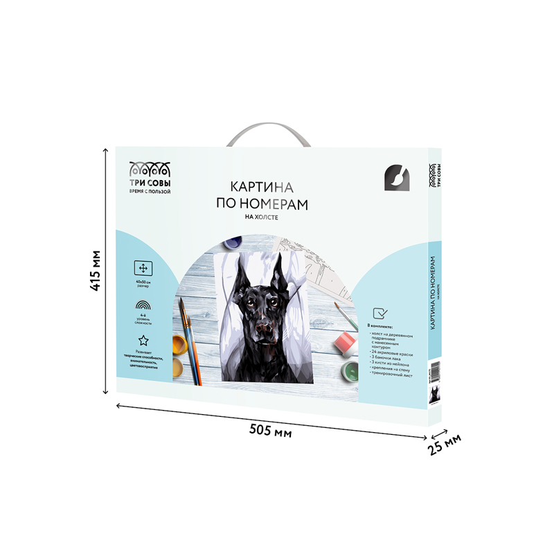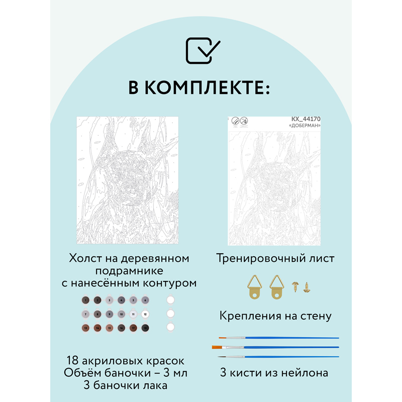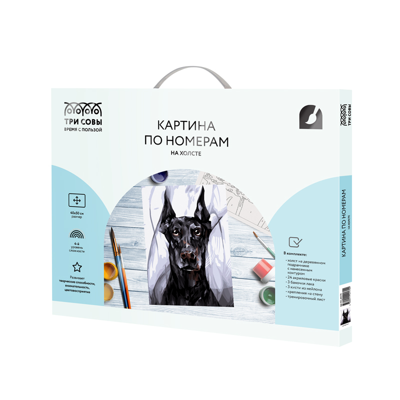 Картина по номерам на холсте ТРИ СОВЫ «Доберман» раскрывает творческие способности как детей, так и взрослых. Данный метод рисования способствует развитию внимания и концентрации, аккуратности, пониманию концепции построения фигуры через цветовые оттенки, развивает чувство вкуса.В набор входят:1) холст на деревянном подрамнике 40*50 с нанесенным контуром, пронумерованный в соответствии с номерами красок. Контур под раскрашивание нанесен в том числе и на торцы подрамника, что позволяет разместить готовую работу на стене, не обрамляя в багет или раму. Технология точной разбивки сюжета картины на разные цветовые оттенки гарантируют правильность исполнения полотна;2) 24 акриловые краски на водной основе в пронумерованных баночках. Краски с высокой укрывистостью;3) 3 баночки с глянцевым защитным лаком;4) 3 кисти из эластичного нейлонового волокна;5) крепления на стену;6) тренировочный лист.«ТРИ СОВЫ» − время с пользой!• Тематика: животные;• Уровень сложности: 4.