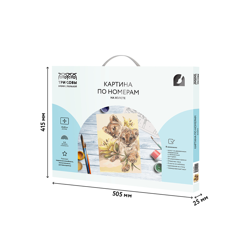 Рисование картин по номерам на холсте − это увлекательное хобби для детей и взрослых. Процесс способствует развитию внимания и концентрации, аккуратности и развивает чувство вкуса.Готовая картина бренда «ТРИ СОВЫ» может украсить интерьер и стать прекрасными подарком.В набор входят:• холст на деревянном подрамнике 40х50 с нанесенным контуром, пронумерованный в соответствии с номерами красок. Контур под раскрашивание нанесен в том числе и на торцы подрамника, что позволяет разместить готовую работу на стене, не обрамляя в багет или раму. Технология точной разбивки сюжета картины на разные цветовые оттенки гарантируют правильность исполнения полотна;• 24 акриловые краски на водной основе в пронумерованных баночках. Краски с высокой укрывистостью;• 3 баночки с глянцевым защитным лаком;• 3 кисти из эластичного нейлонового волокна;• крепления на стену;• тренировочный лист.«ТРИ СОВЫ» − время с пользой!
