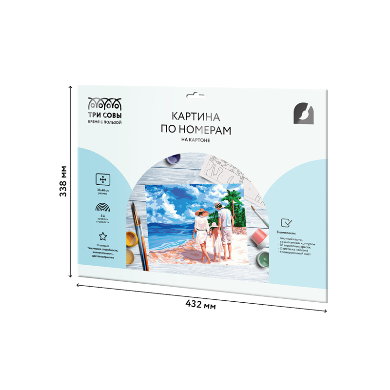 Картина по номерам на картоне бренда «ТРИ СОВЫ» станет увлекательным хобби, которое будет интересно как детям, так и взрослым.В набор «Отпуск на море» входят:1. плотный картон с тиснением под холст размером 30х40 см с нанесенным контуром, пронумерованный в соответствии с номерами красок;2. 18 акриловых красок на водной основе в пронумерованных баночках;3. Кисти из эластичного нейлонового волокна 2 штуки: малая и средняя;4. лист для тренировки – 1 штука.Краски обладают высокой плотностью, что позволяет перекрыть нанесенный контур в 1 слой. Технология точной разбивки сюжета картины на разные цветовые оттенки гарантируют правильность выполнения рисунка. Законченная работа с изображением пляжа займет почетное место в интерьере или станет отличным подарком.Рисование по номерам способствует развитию внимания, учит концентрации и аккуратности, помогает понять, как построить фигуру через цветовые оттенки, развивает чувство вкуса. Художником может быть каждый!«ТРИ СОВЫ» – время с пользой!• Основа: картон;• Формат: А3;• Размер: 30*40 см;• Уровень сложности: 5;• Количество баночек с красками: 18.