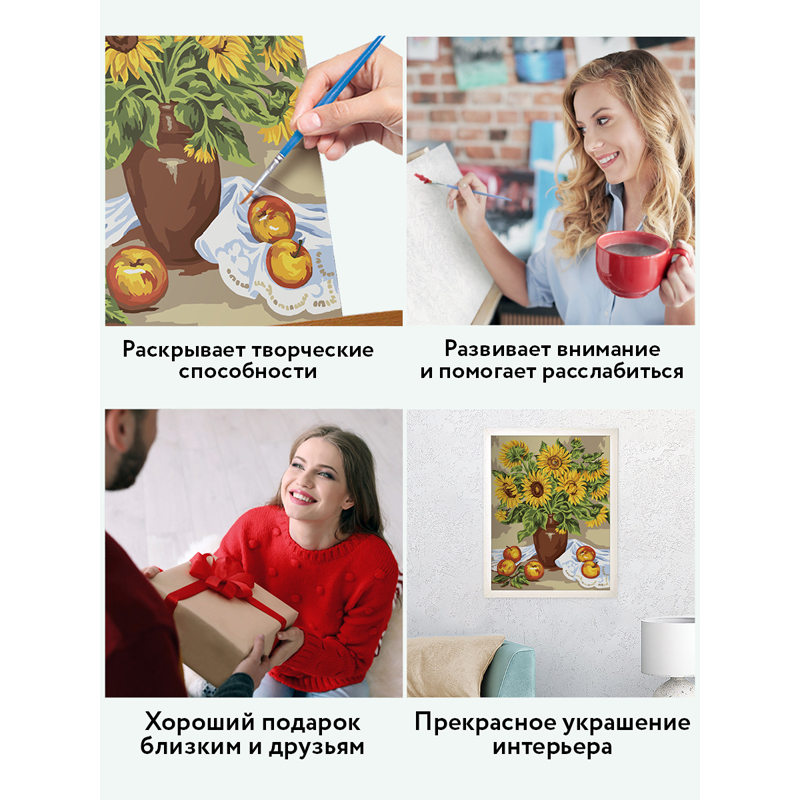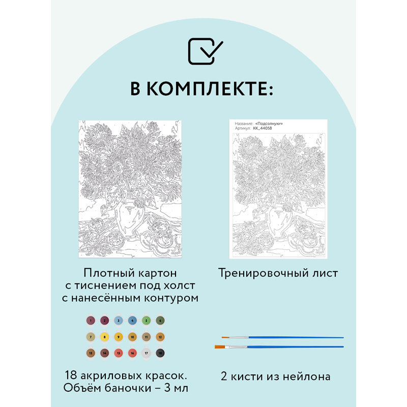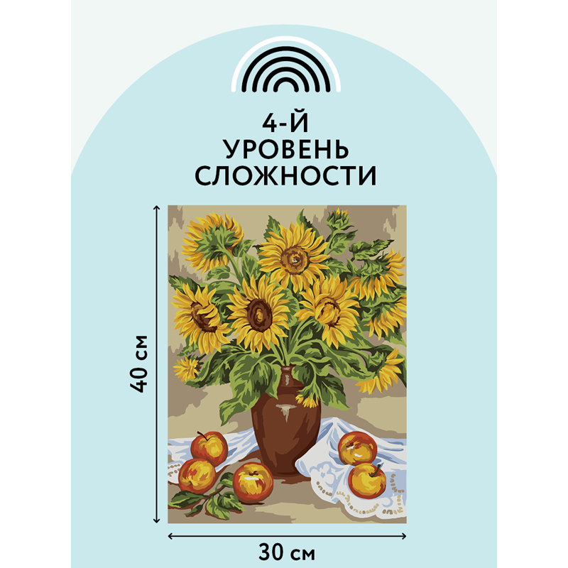 Картина по номерам на картоне бренда «ТРИ СОВЫ» станет увлекательным хобби, которое будет интересно как детям, так и взрослым.В набор «Подсолнухи» входят:1. плотный картон с тиснением под холст размером 30х40 см с нанесенным контуром, пронумерованный в соответствии с номерами красок;2. 18 акриловых красок на водной основе в пронумерованных баночках;3. Кисти из эластичного нейлонового волокна 2 штуки: малая и средняя;4. лист для тренировки – 1 штука.Краски обладают высокой плотностью, что позволяет перекрыть нанесенный контур в 1 слой. Технология точной разбивки сюжета картины на разные цветовые оттенки гарантируют правильность выполнения рисунка. Законченная работа с изображением подсолнухов займет почетное место в интерьере или станет отличным подарком.Рисование по номерам способствует развитию внимания, учит концентрации и аккуратности, помогает понять, как построить фигуру через цветовые оттенки, развивает чувство вкуса. Художником может быть каждый!«ТРИ СОВЫ» – время с пользой!• Основа: картон;• Формат: А3;• Размер: 30*40 см;• Уровень сложности: 4;• Количество баночек с красками: 18.